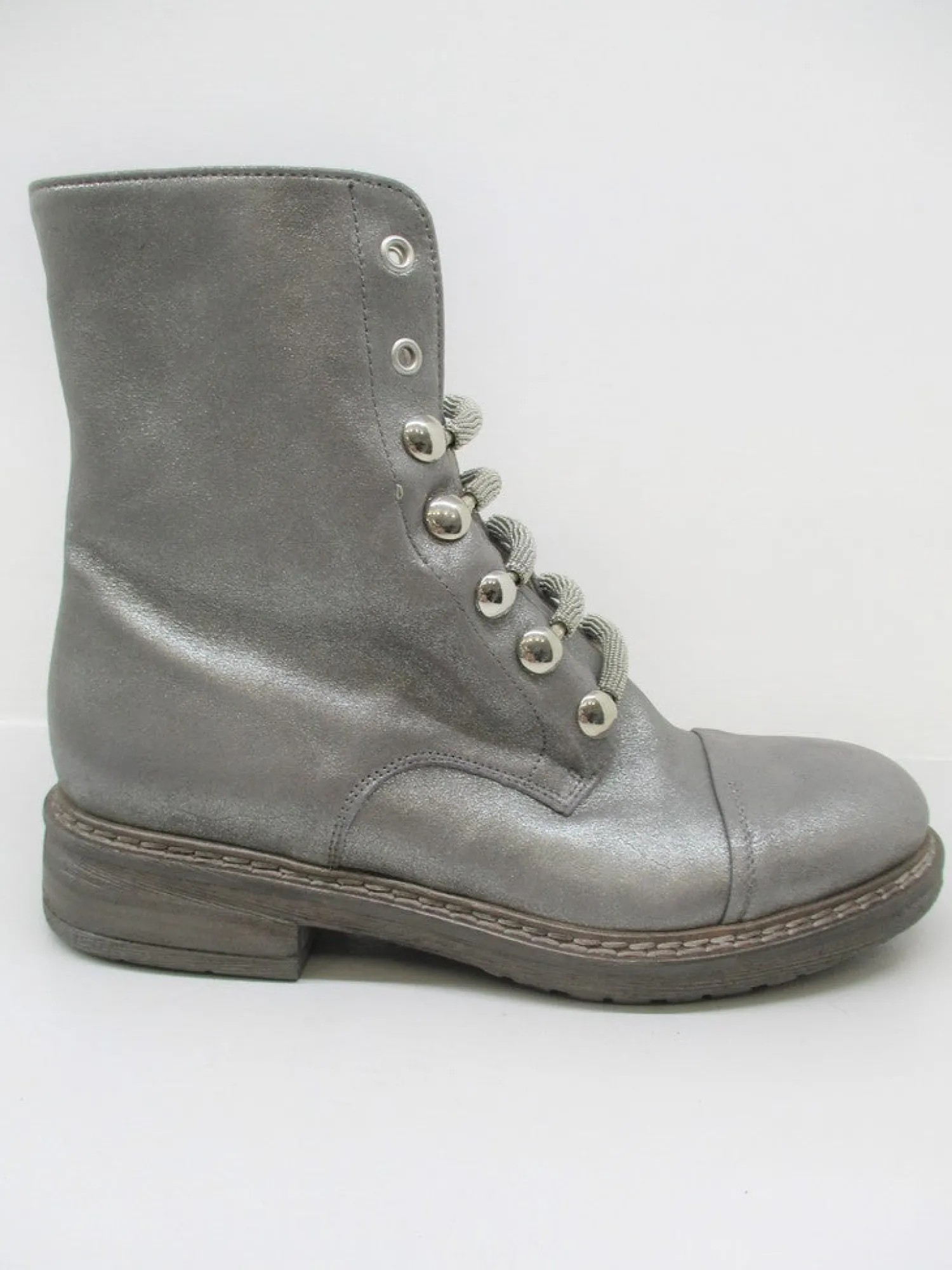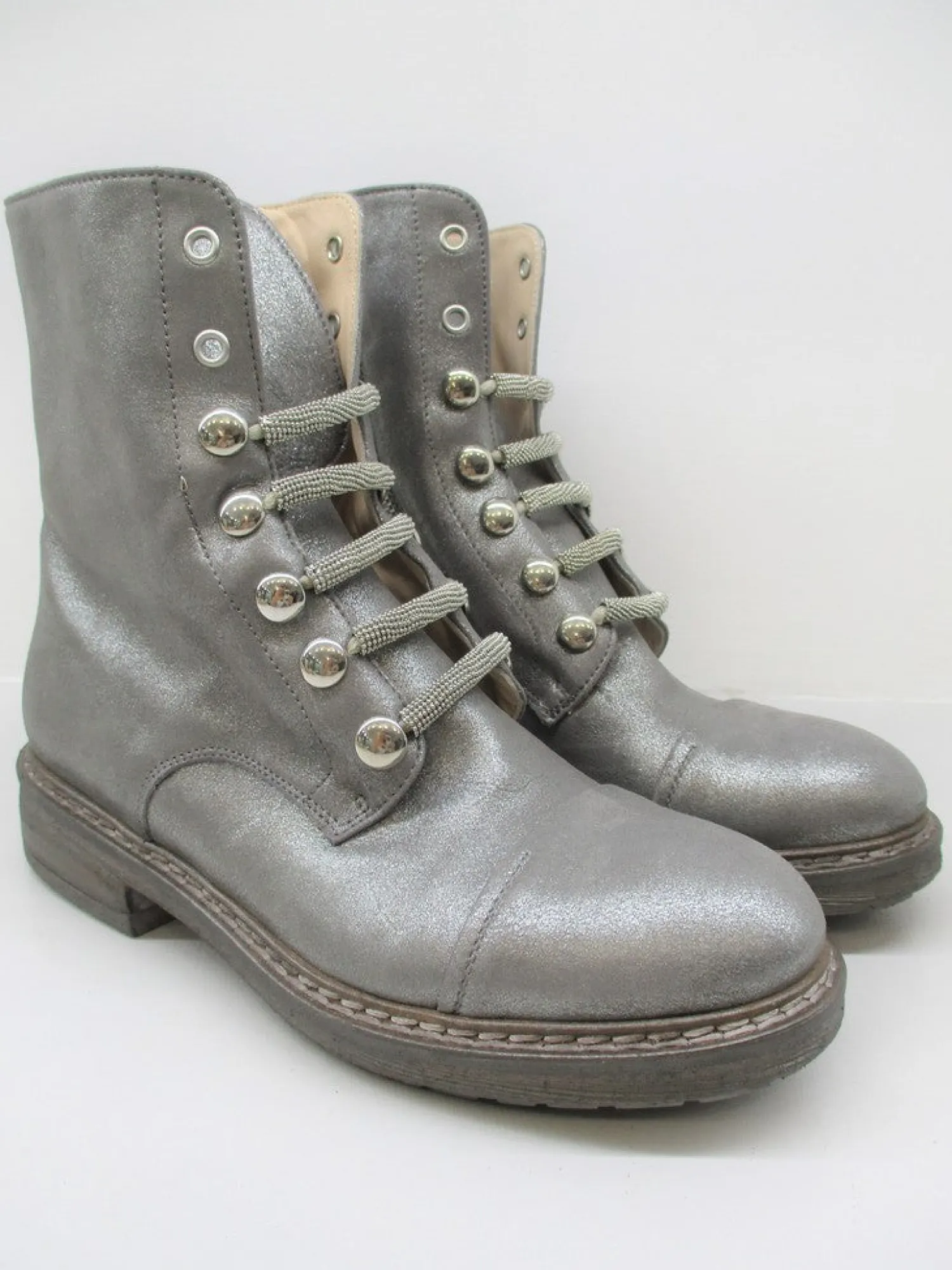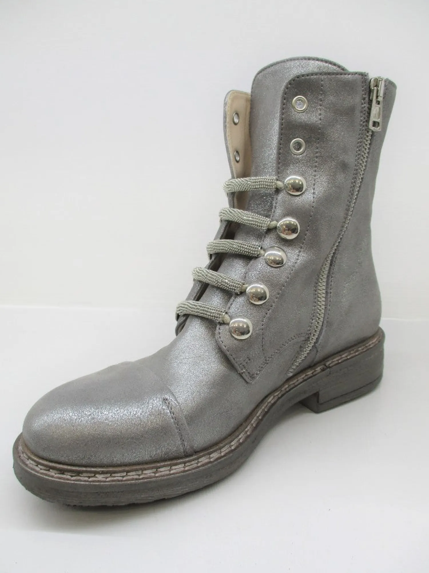 Anfibio in pelle effetto glitter con lacci borchiati.Fondo in gomma. Altezza tacco 2 cm.