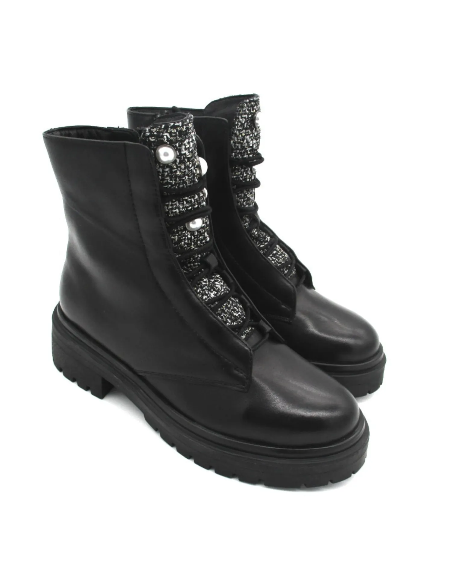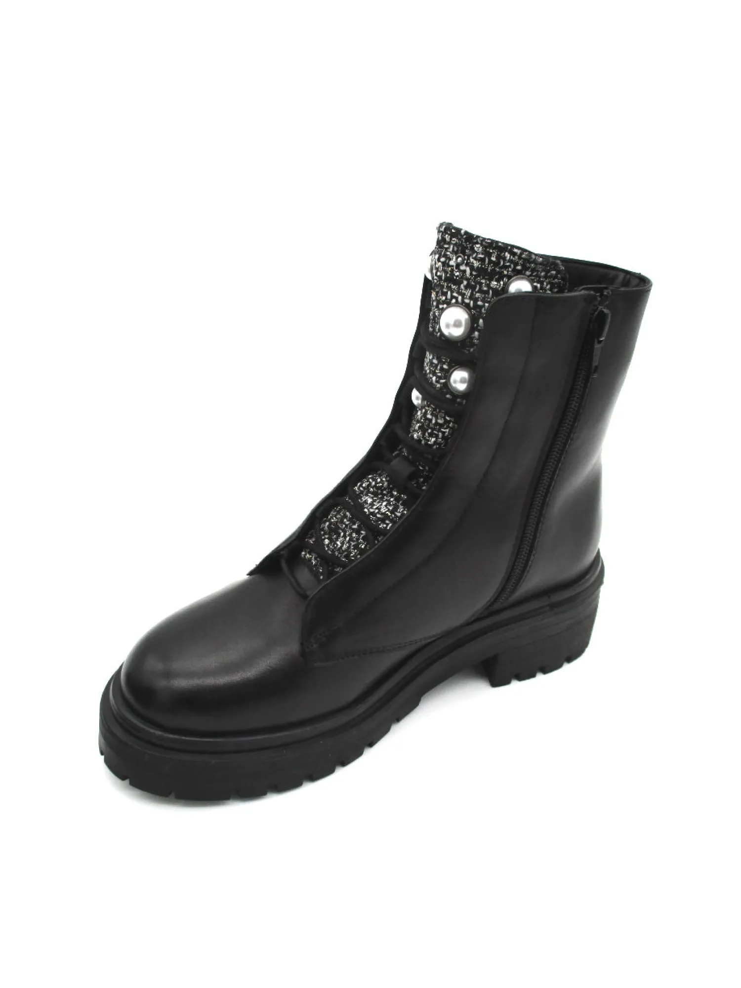 Look raffinato e moderno per CAMELIA, stivaletto allacciato impreziosito dal tessuto tramato del linguettone e decorato con una grande perla. Accesso facilitato da zip laterale. Il plantare in pelle è morbido ed ergonomico, il fondo con battistrada scolpito è robusto e resistente.