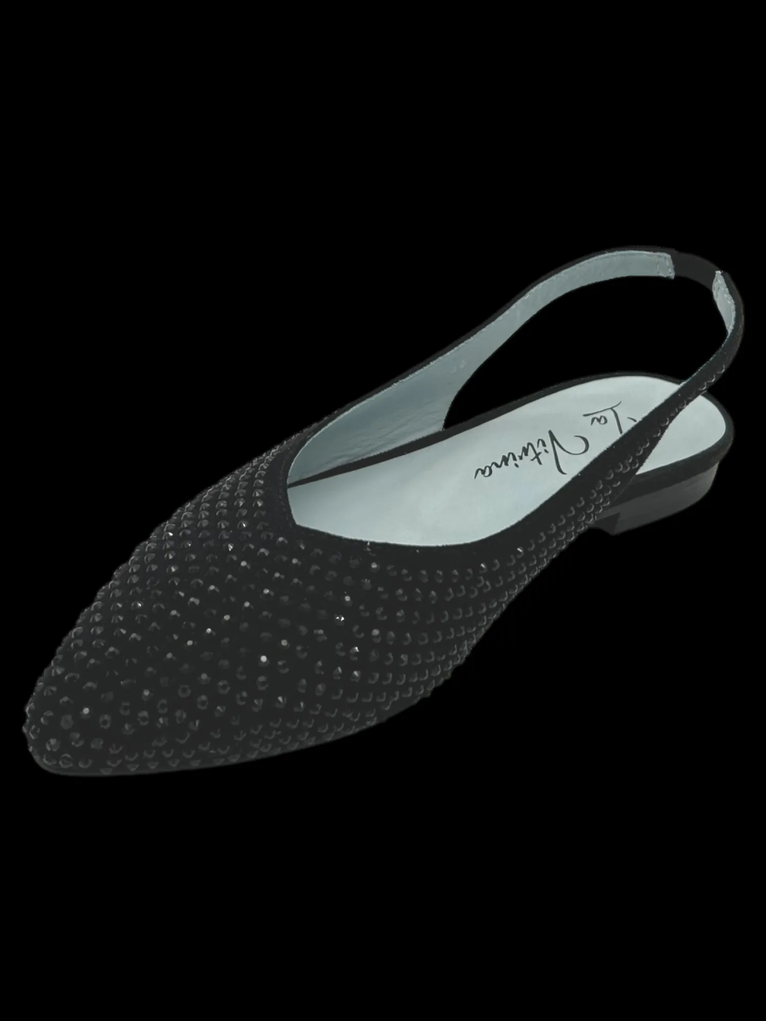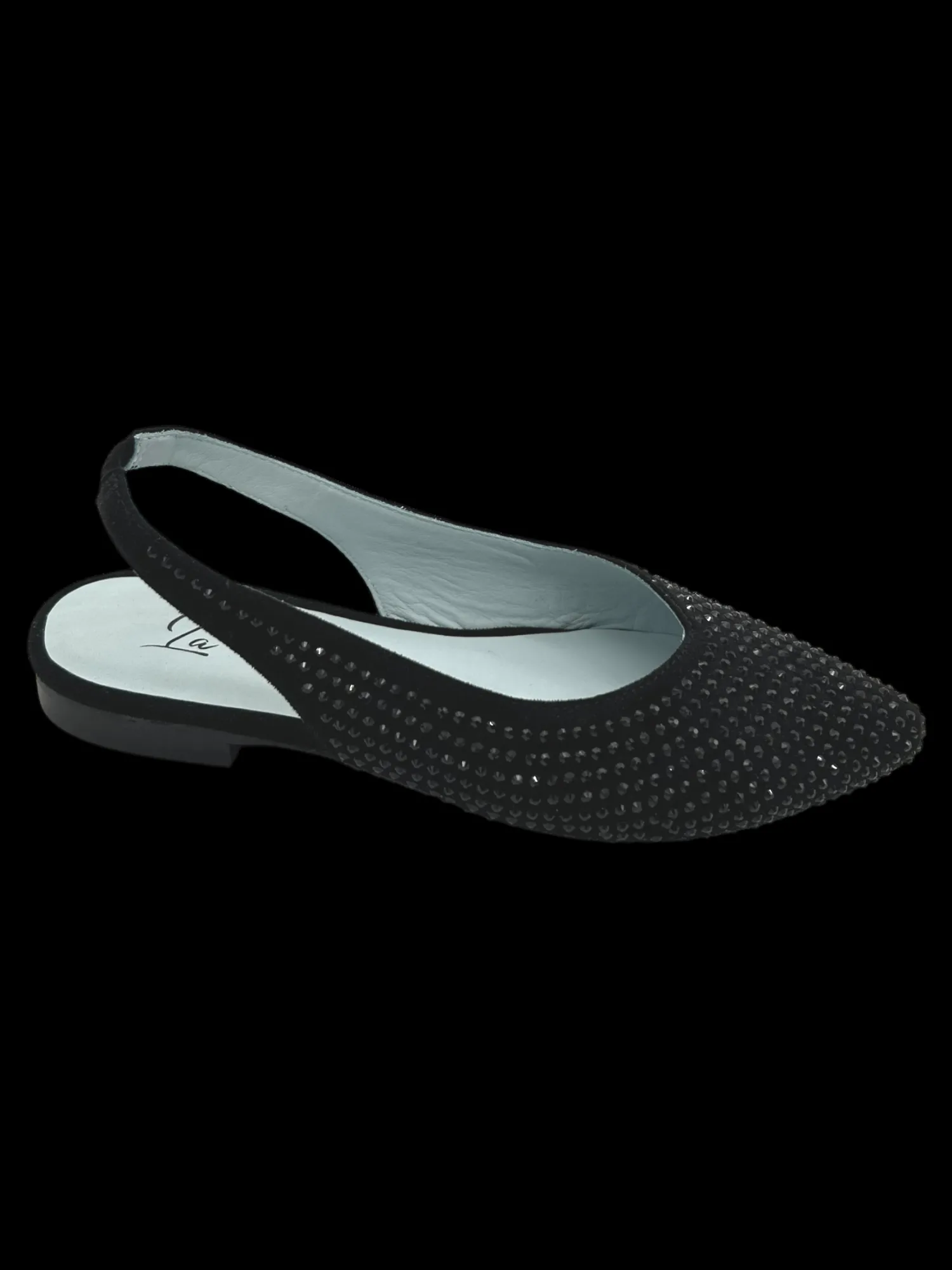 Ballerina nera in pelle scamosciata con fondo soft e strass, tacco altezza 2 cm.
