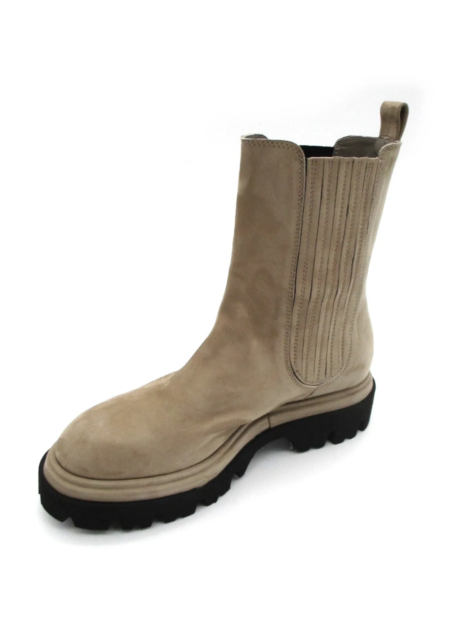 Beatles donna in camoscio, suola in gomma extra light, inserti laterali elasticizzati e design tondo.