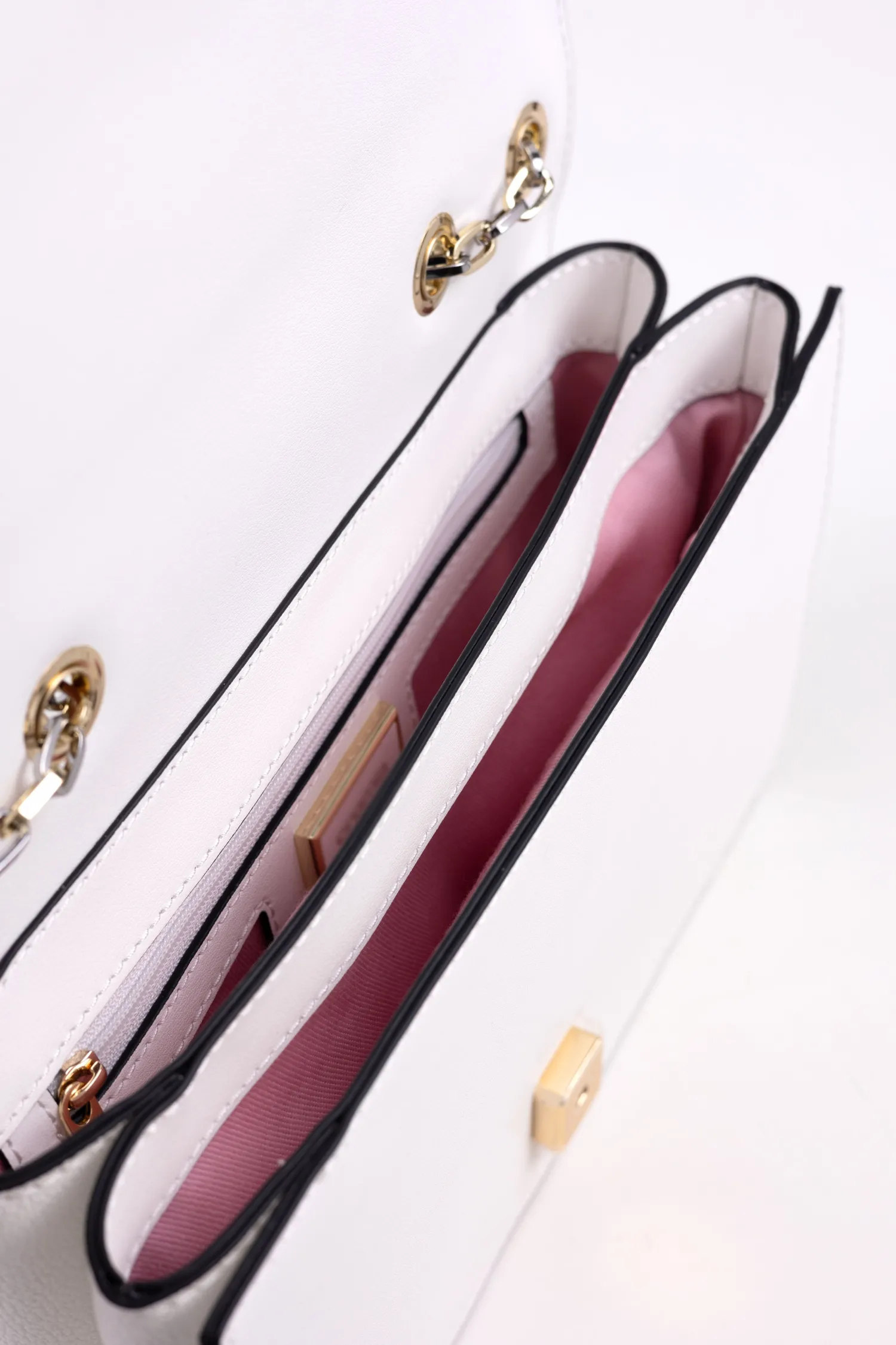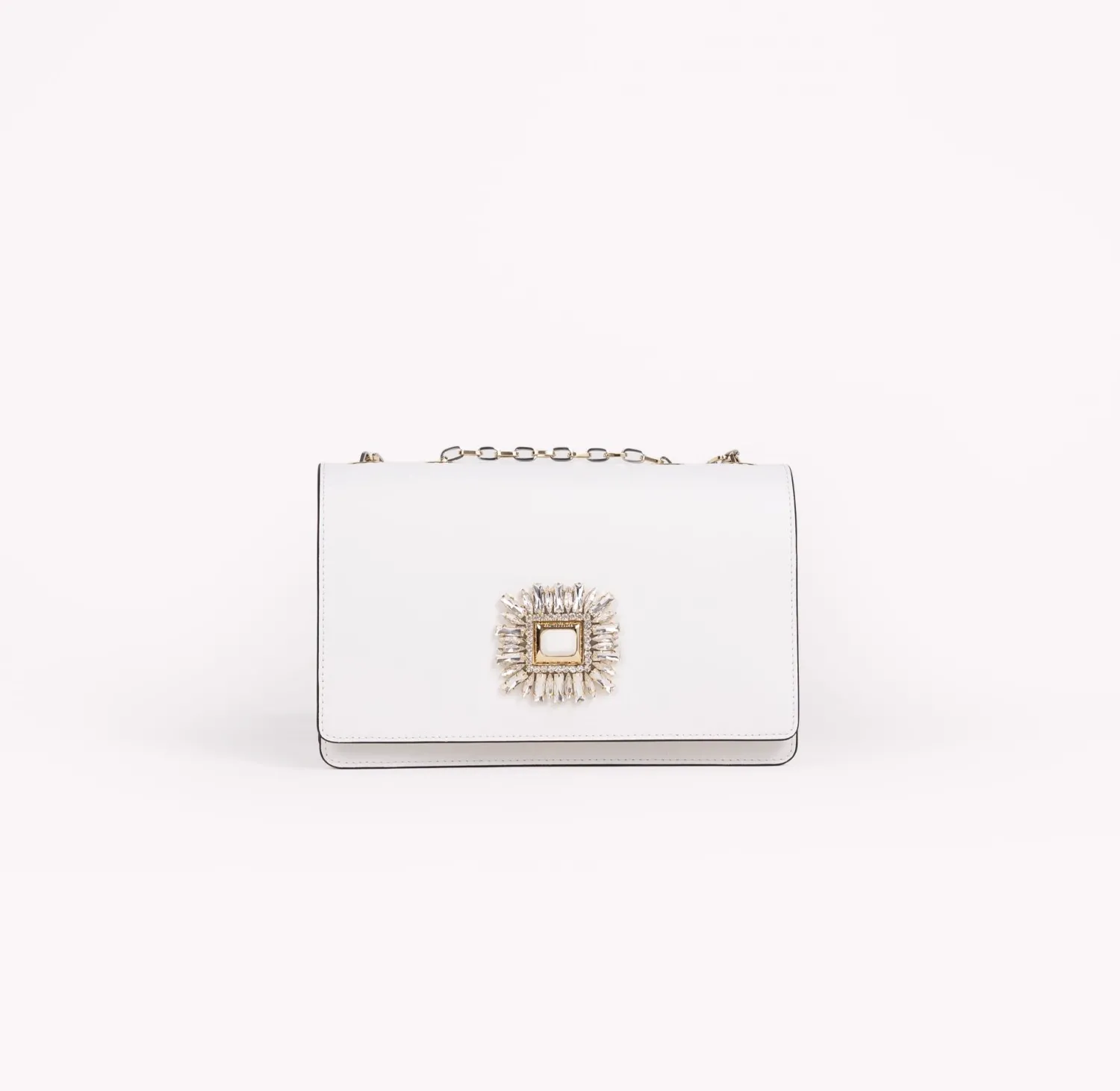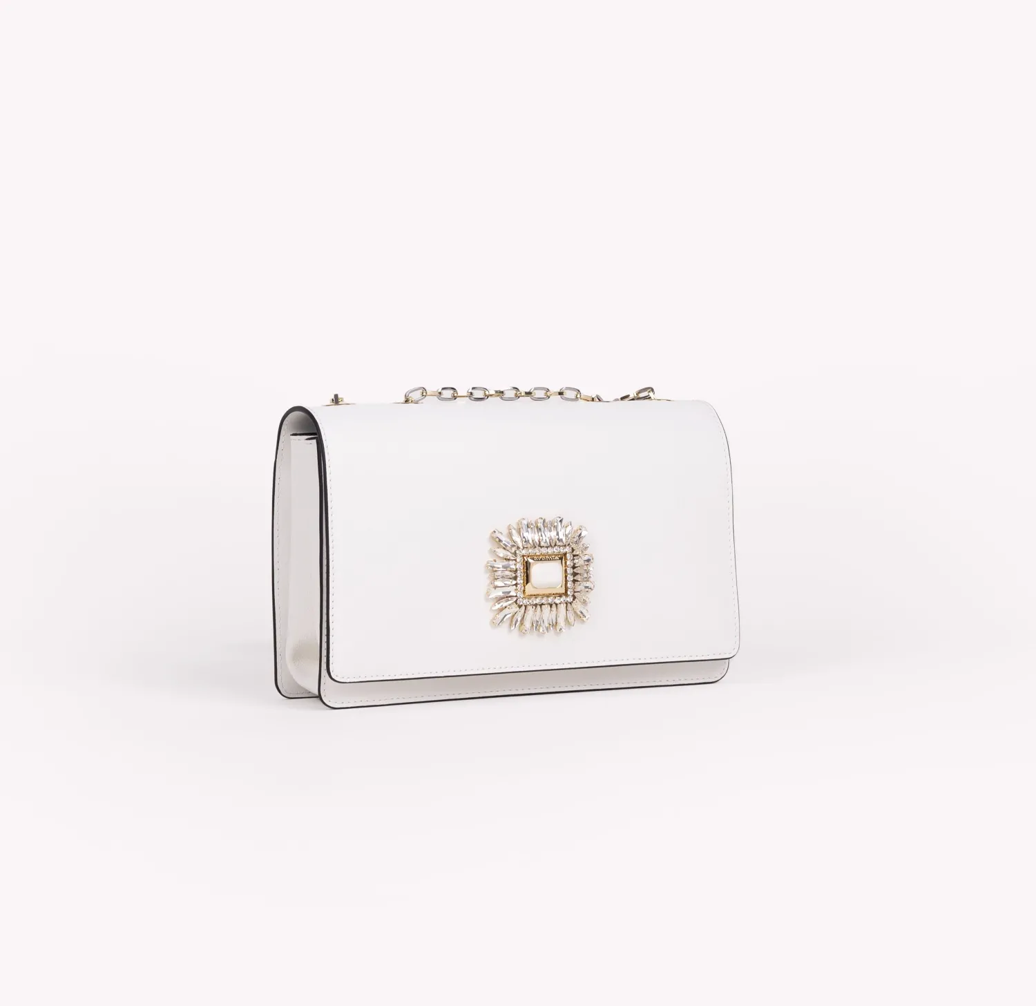 Borsa con patta e tracolla realizzata in vitello Bianco con decoro dorato , impreziosita dalla iconica chiusura a girello, altezza cm 15,5 larghezza cm 25.