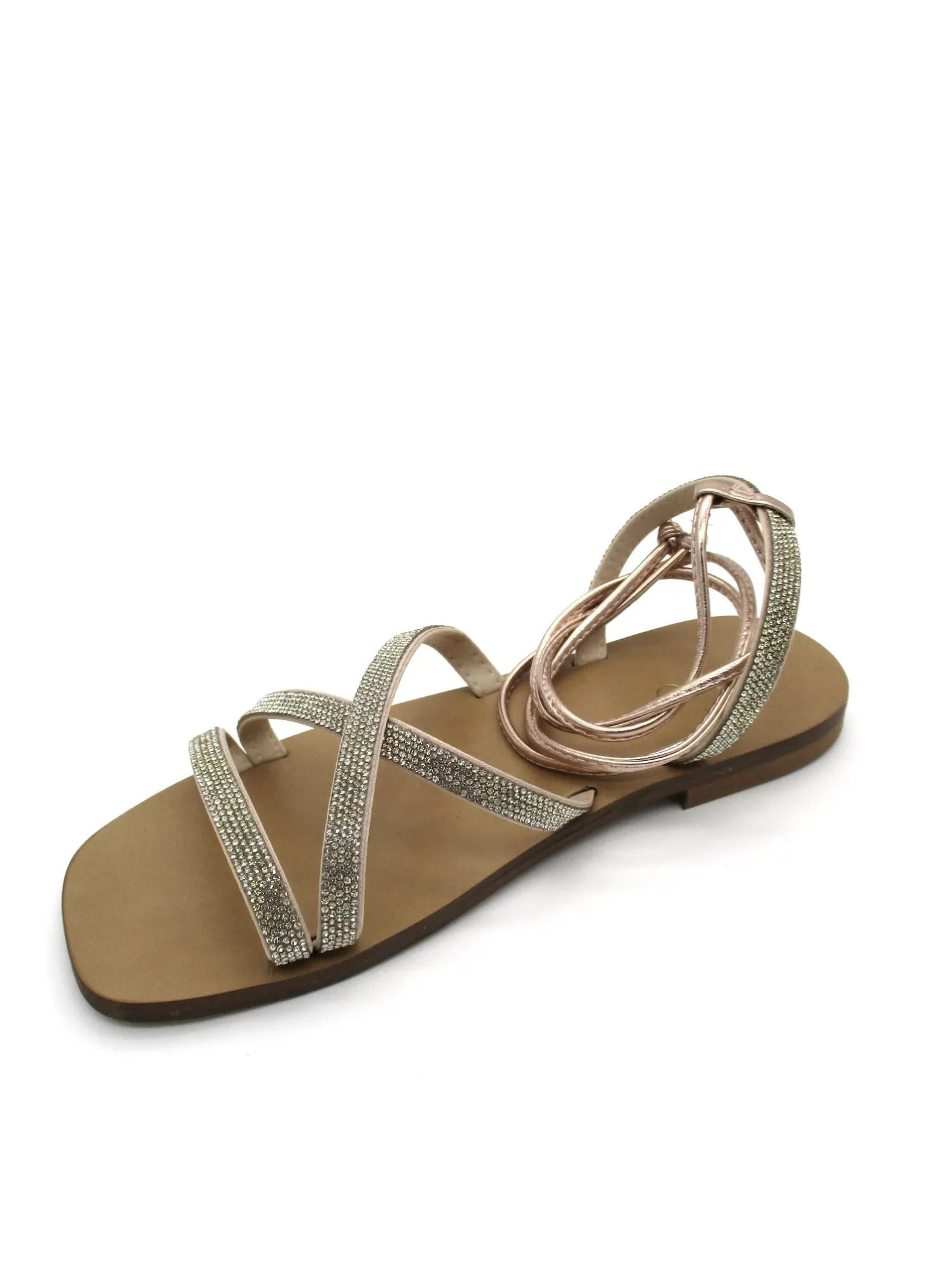 Sandalo basso Saba 05 in pelle glitterato, colore lilla, cinturino regolabile alla caviglia e fondo in gomma altezza 1,5 cm.