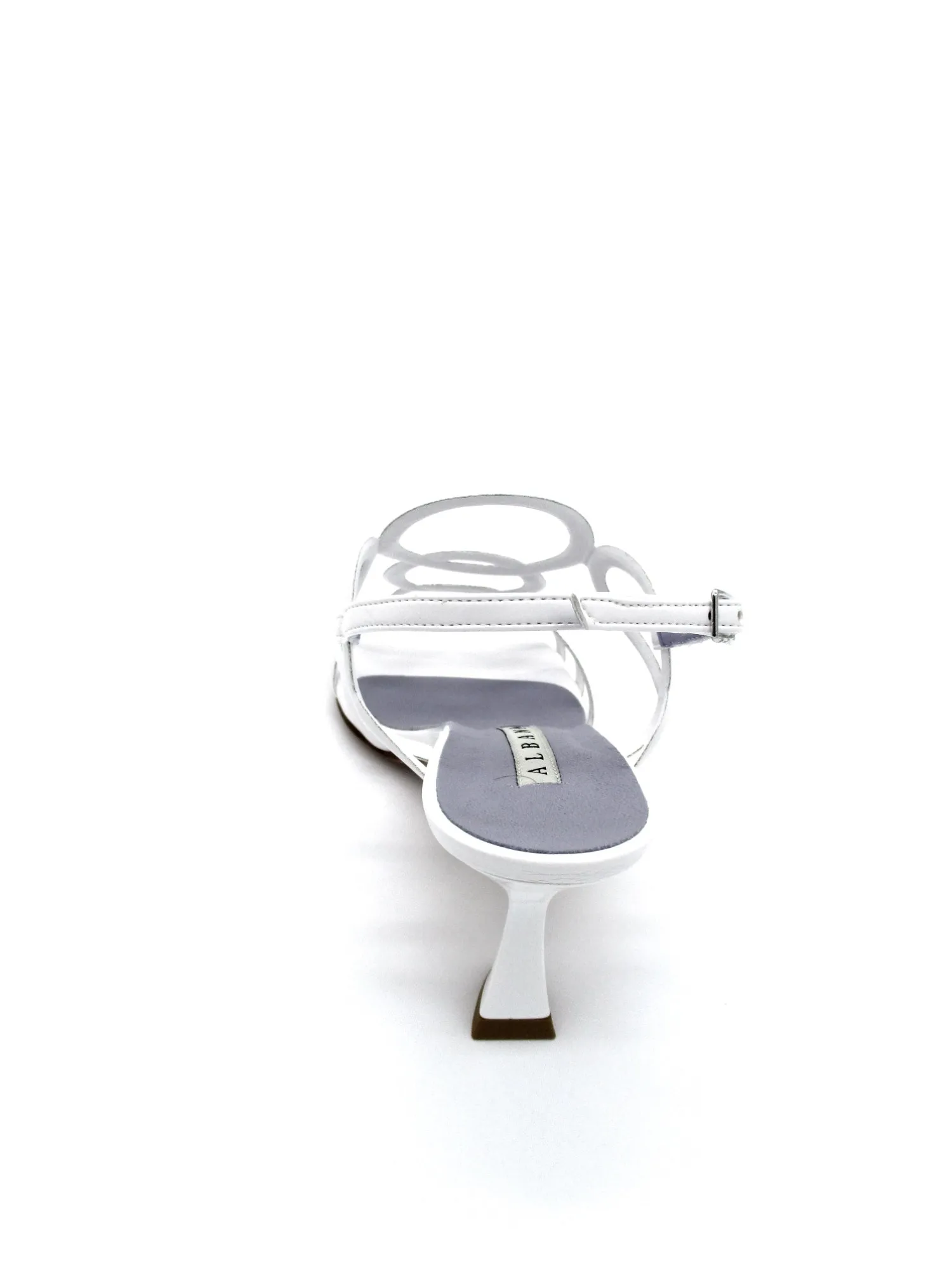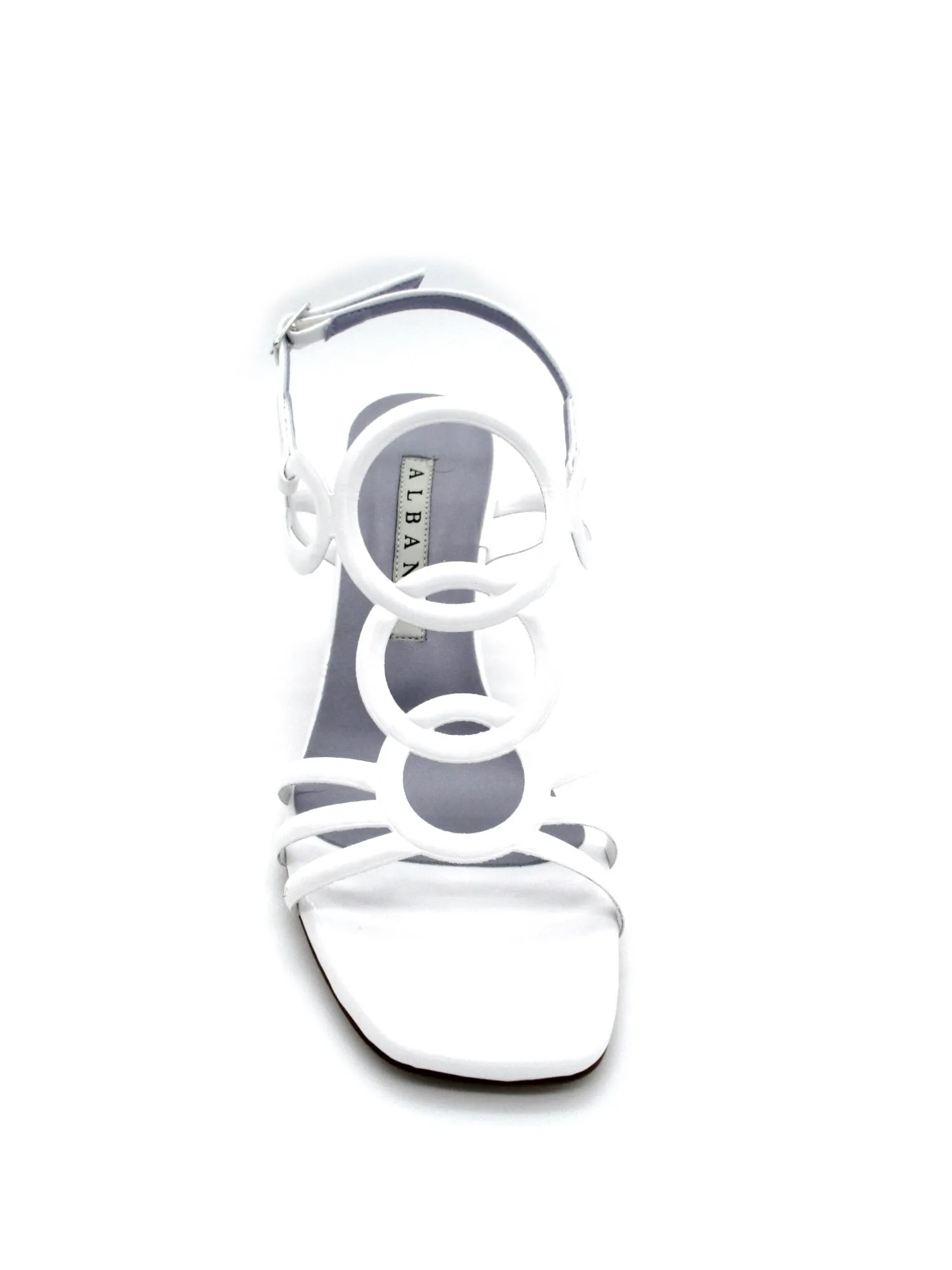 Sandalo comodo realizzato con cerchi di varia misura sul collo del piede, cinturino regolabile alla caviglia, tacco 8 cm e platform di 1 cm.