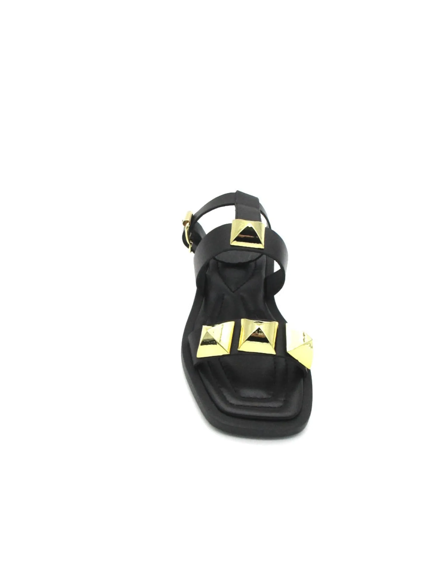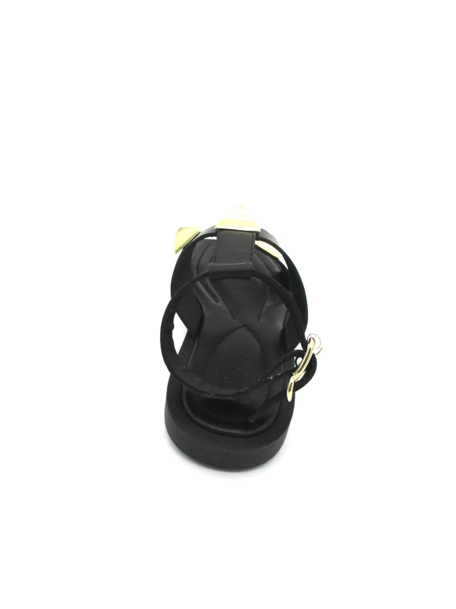 Sandali flat in pelle nera con suola di 2 cm, allacciati attorno alla caviglia con cinturino.