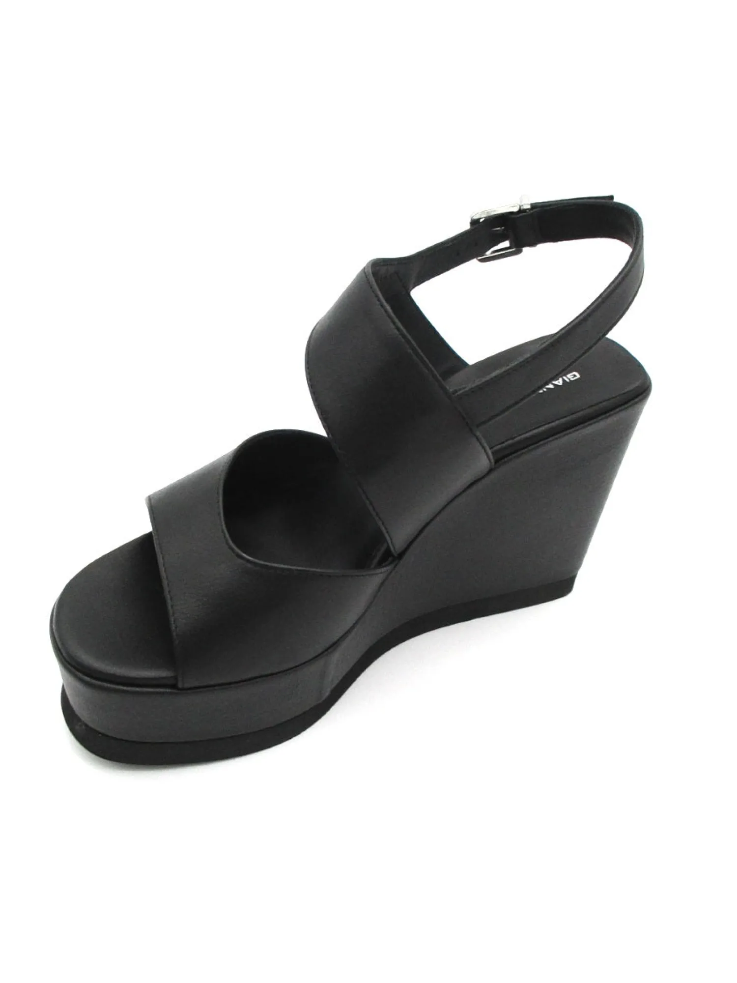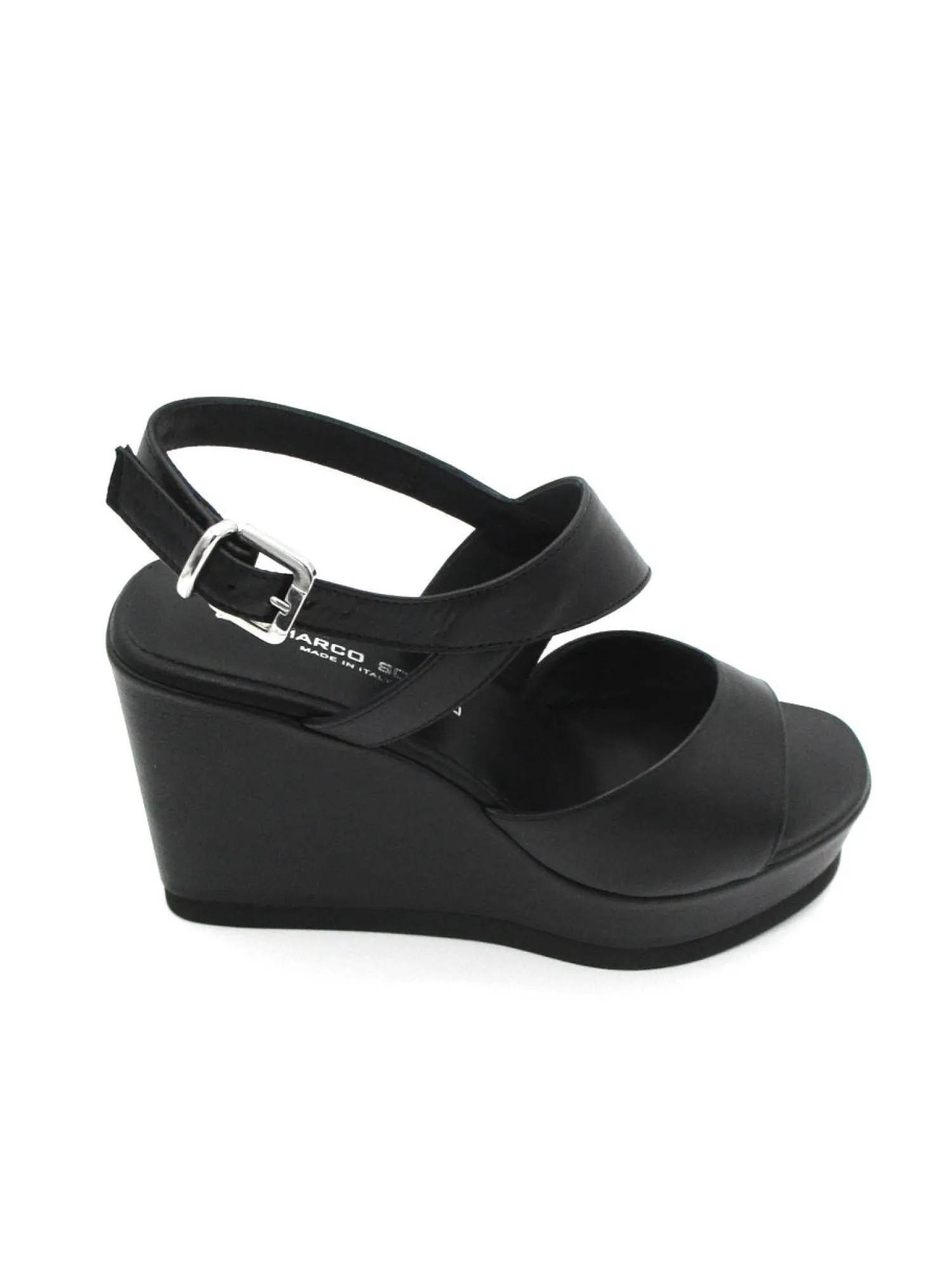 Sandalo in morbida pelle con cinturino alla caviglia regolabile, zeppa di 10 cm. Made in Italy.