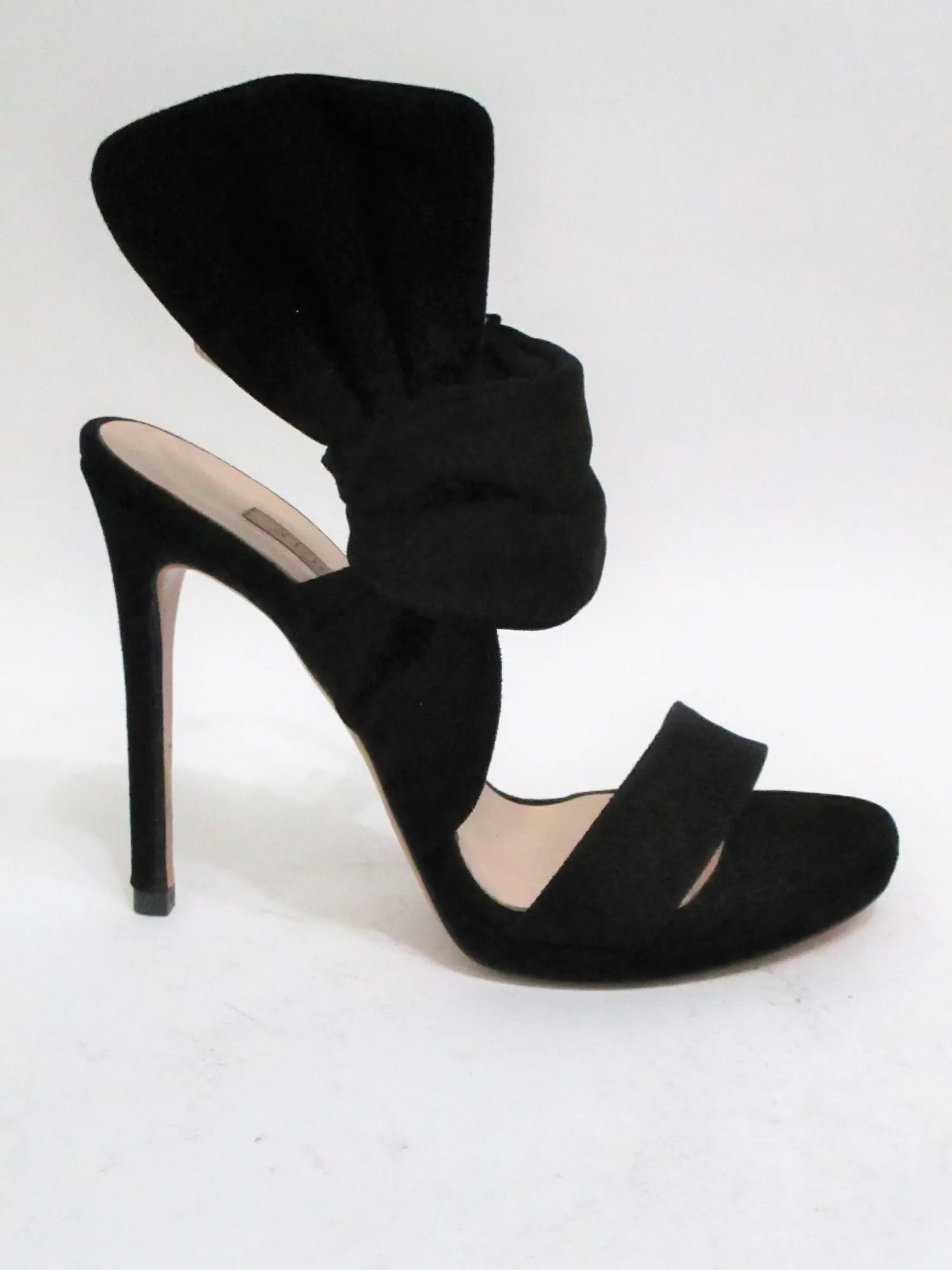 Sandalo in camoscio con fiocco all’esterno del piede. Tacco a stiletto 12 cm, fondo cuoio.