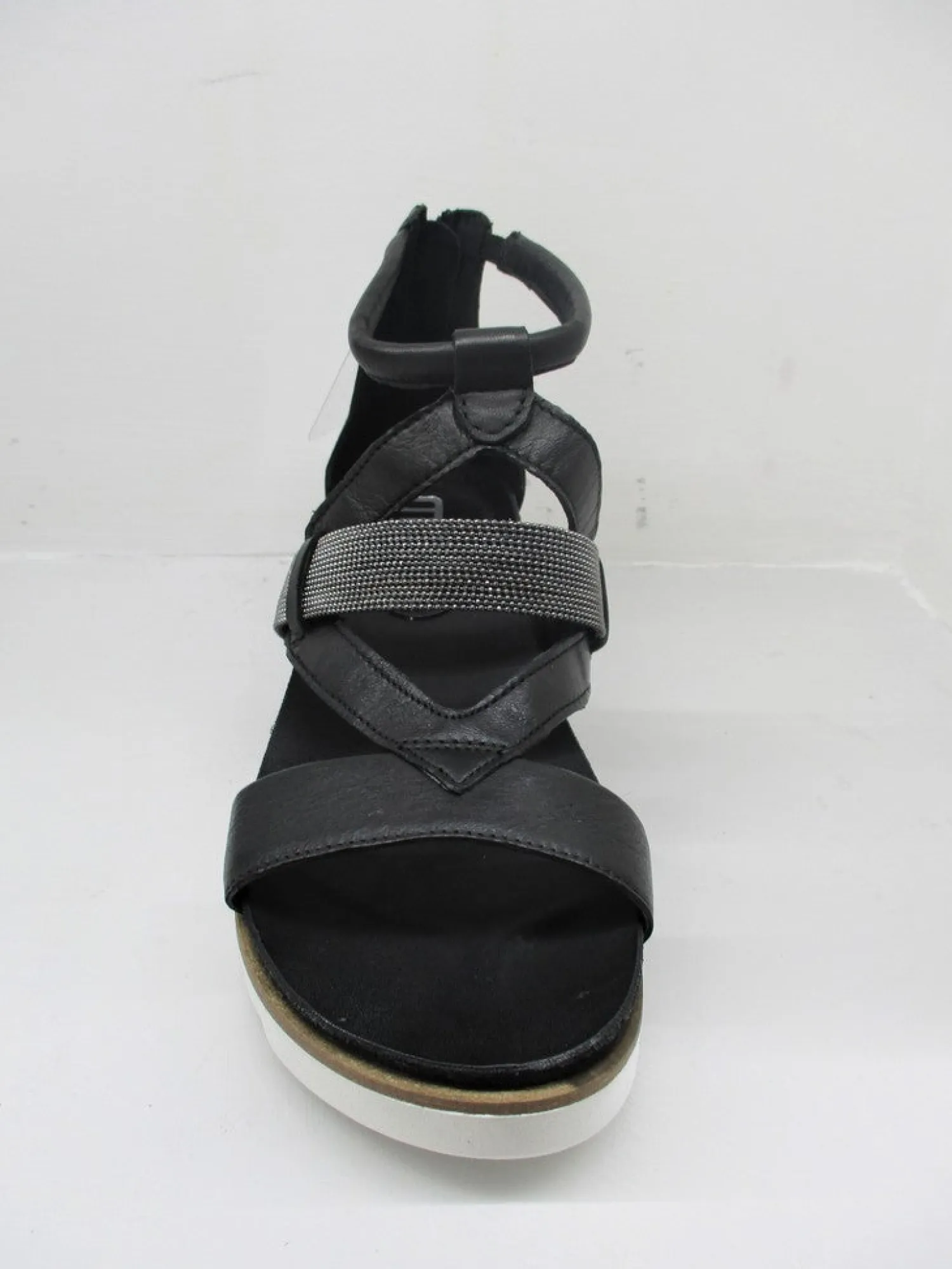 Sandalo zeppa 5 cm in pelle, chiuso dietro con bracciale sul collo del piede, colore nero