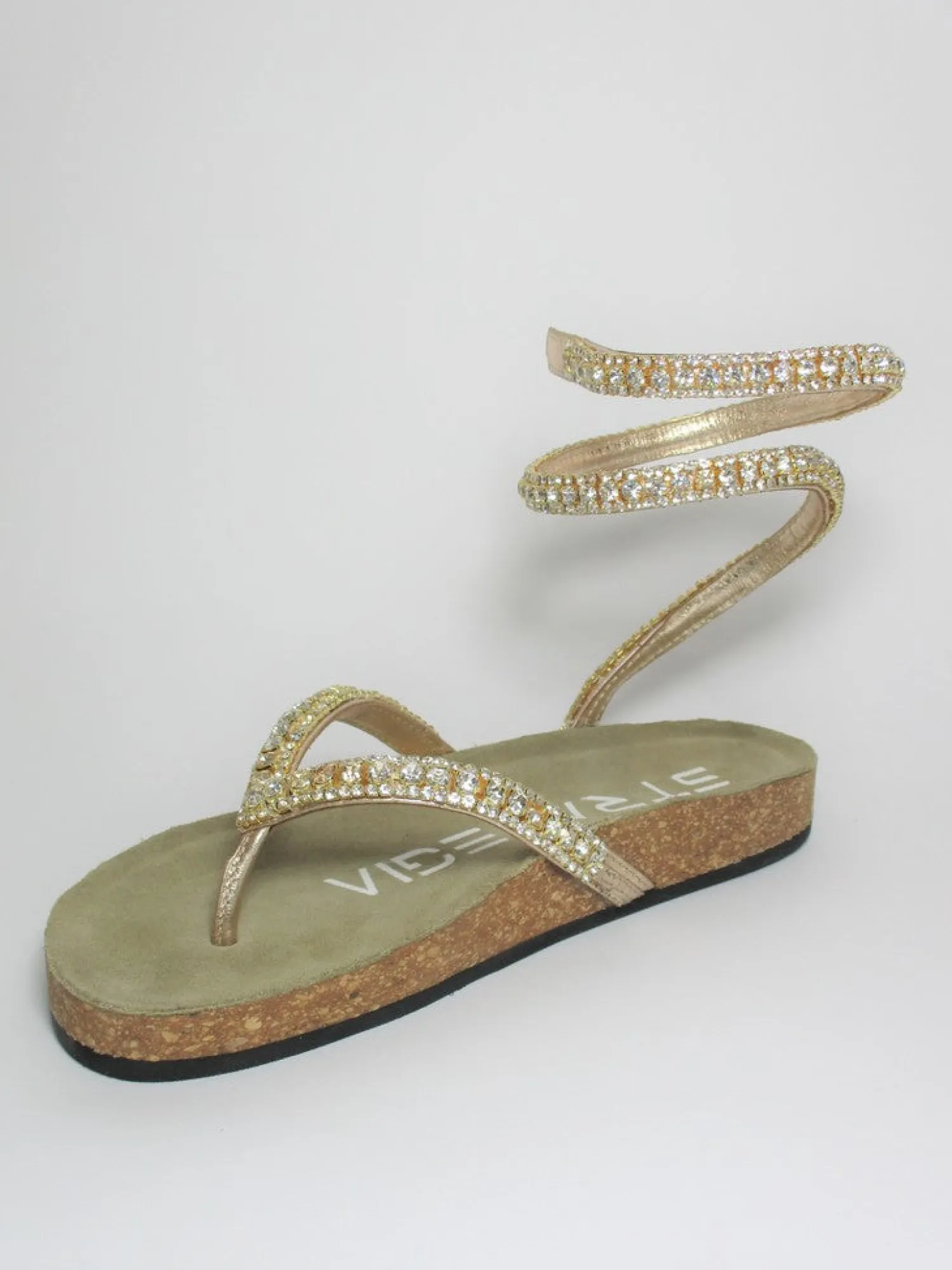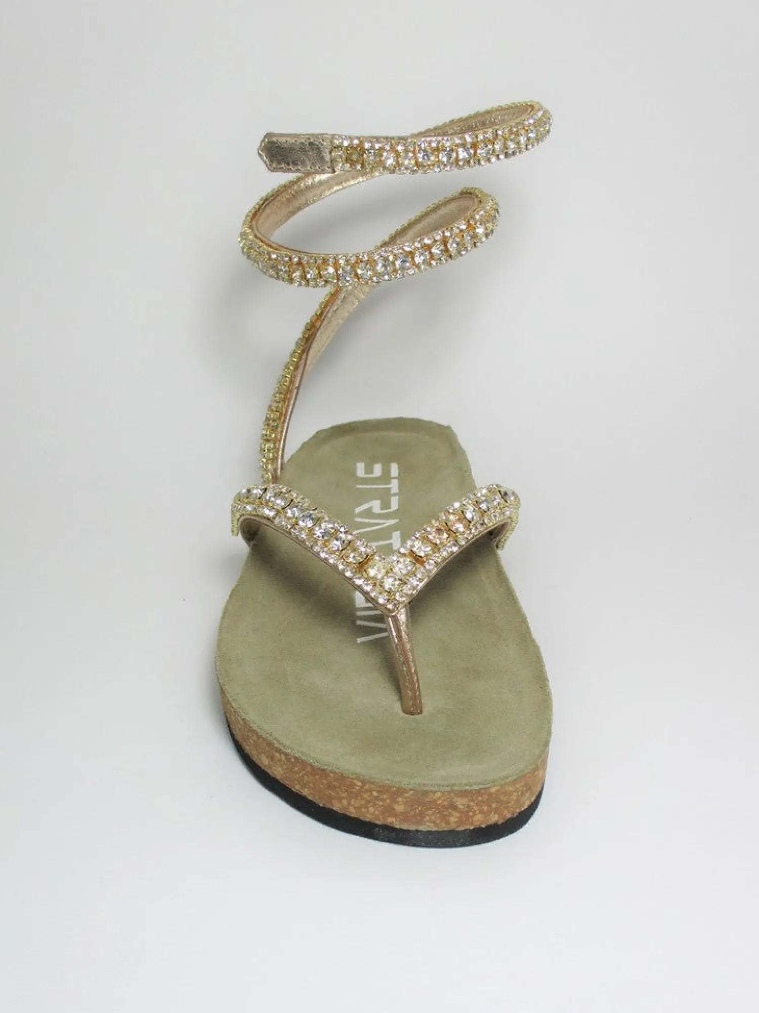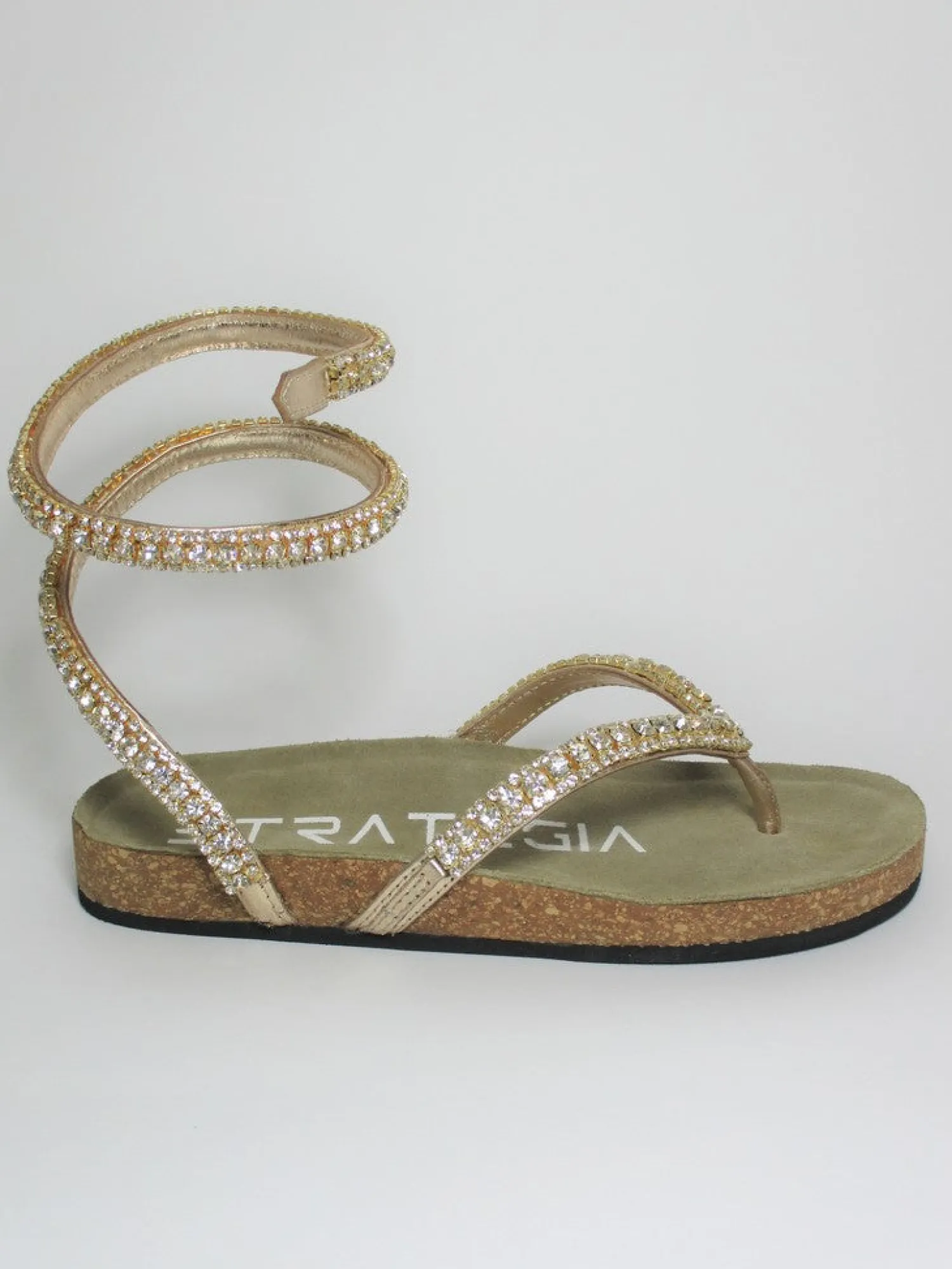 Libera di splendere ogni giorno con il nostro sandalo in pelle con fondo in sughero. Abbiamo rinnovato questo classico estivo con una decorazione di cristalli, infradito e intreccio fin alla caviglia, che donano luce ai tuo outfit e ti faranno sentire una vera diva!