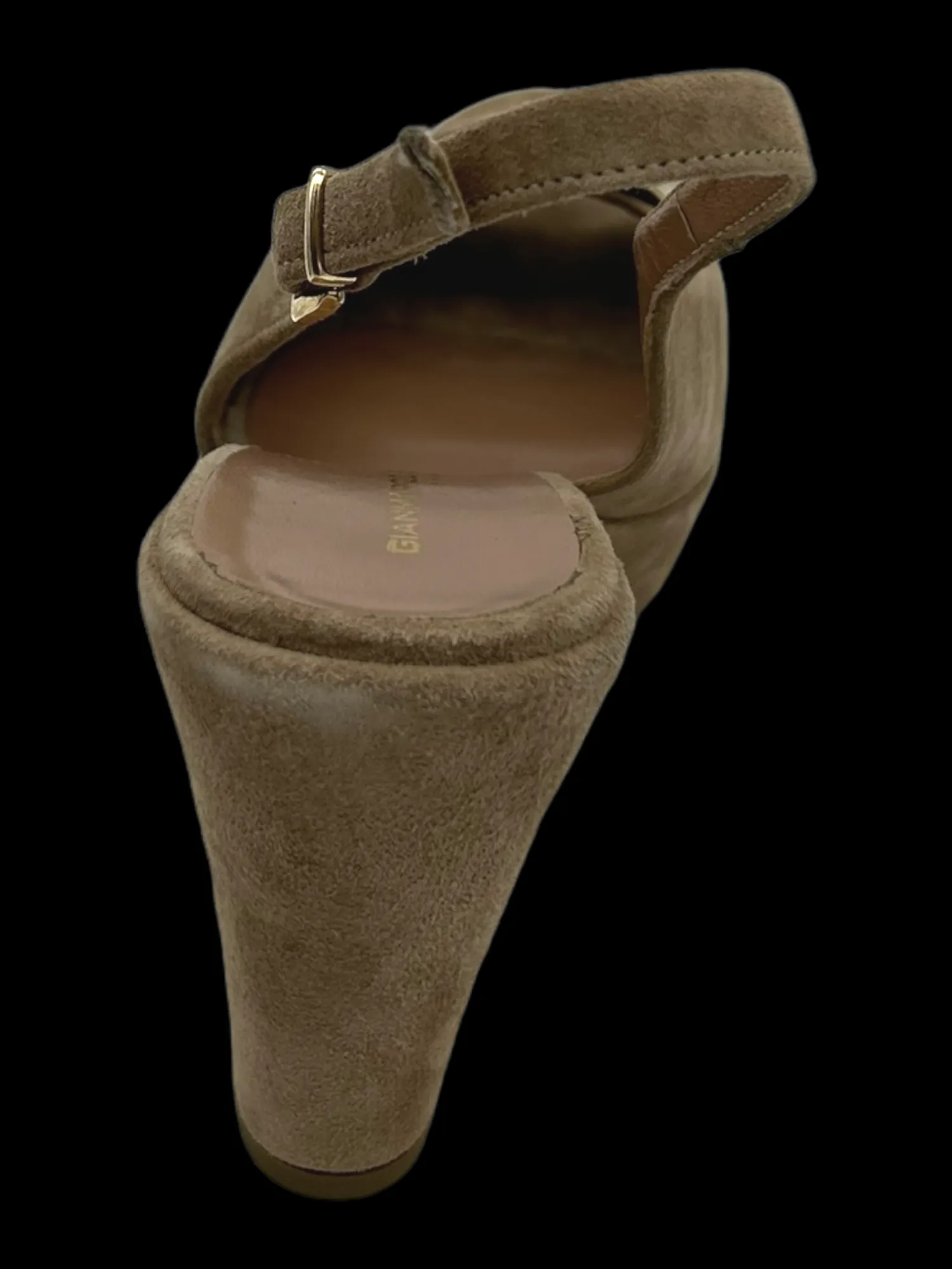Sandalo in morbido camoscio color visone con cinturino alla caviglia regolabile, tacco di 9,5 cm e plateau 3 cm. Made …