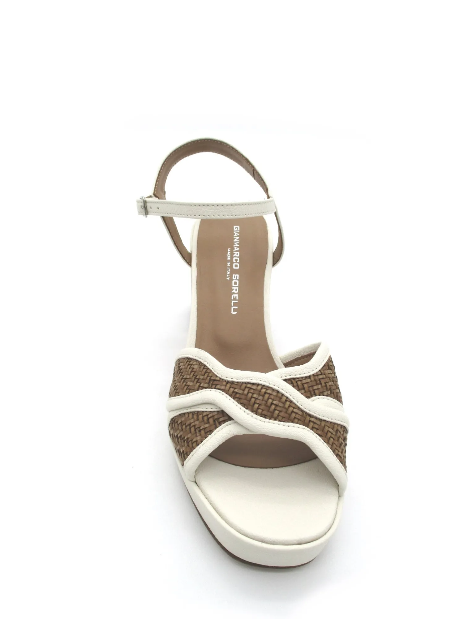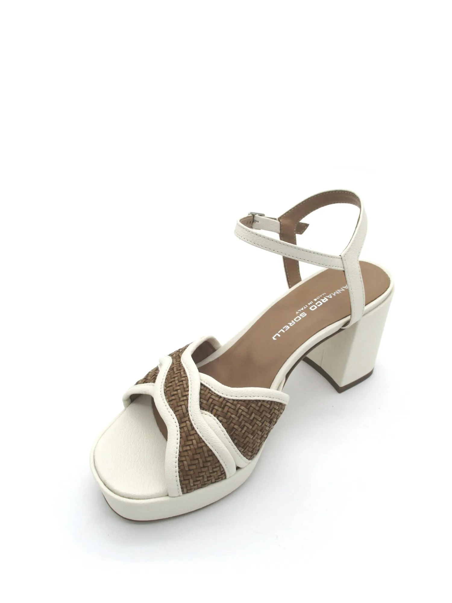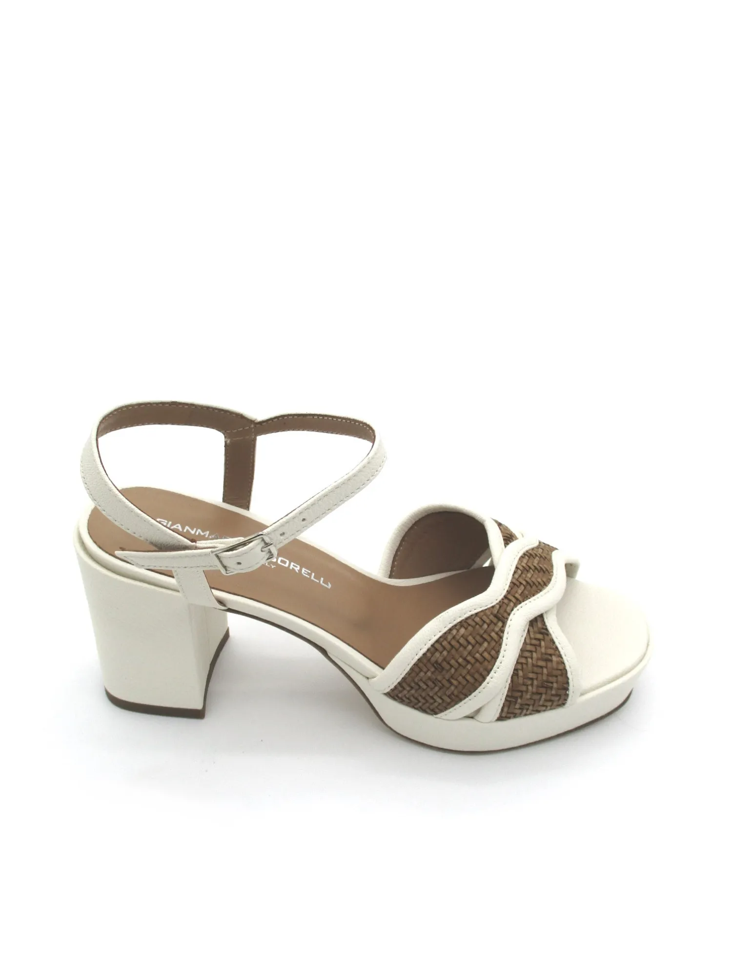 Sandalo in morbida pelle colore milk con inserti a contrasto in canapa color cuoio e cinturino alla caviglia regolabile, tacco di 8 cm. plateau 2,5 cm Made in Italy.