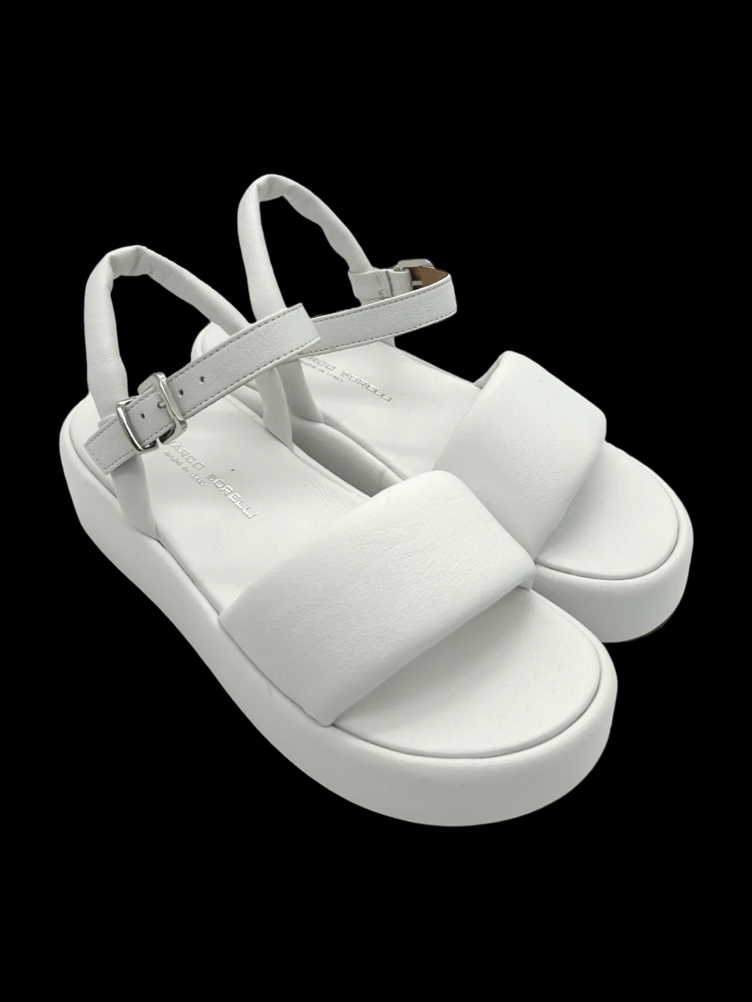 Sandalo in morbida pelle colore Bianco con cinturino alla caviglia regolabile, zeppa di 5 cm e plateau di 3.5 cm. Made in Italy di qualità artigianale.