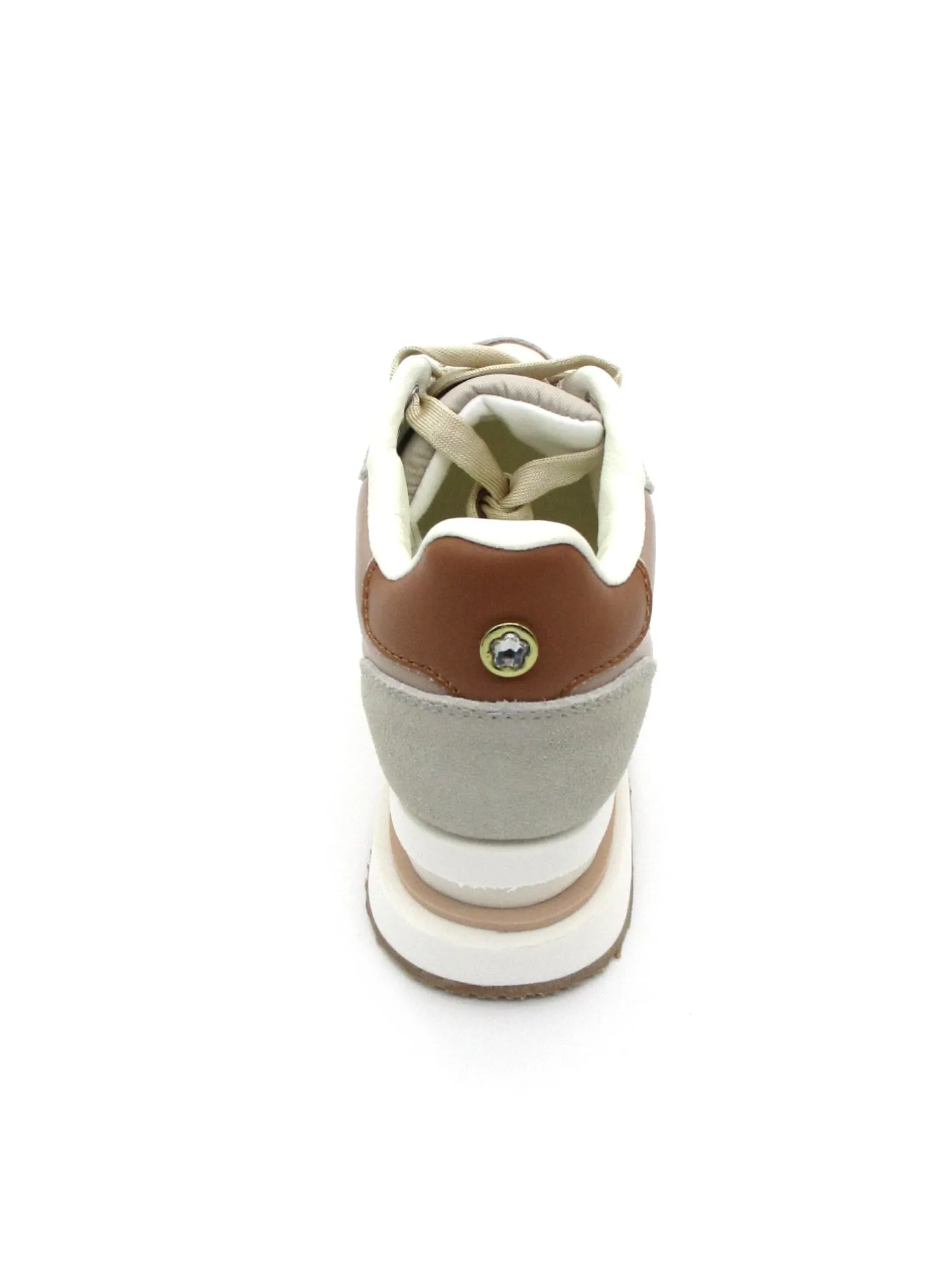Sneaker running da donna in vari materiali modello Marghe colore Cream, fondo in gomma e zeppa interna estraibile di 5,5 cm sul tallone e 2,5cm nella parte anteriore.