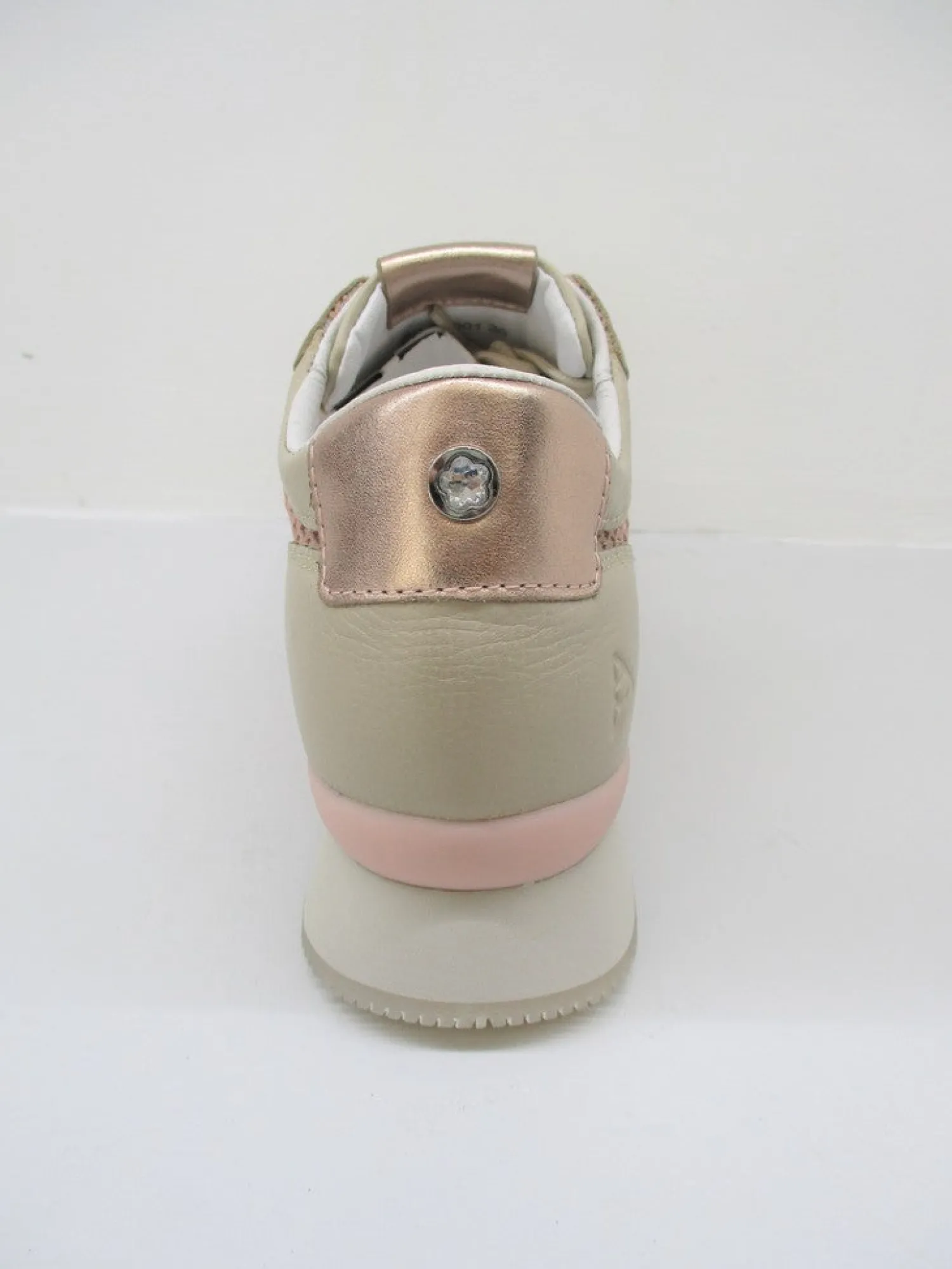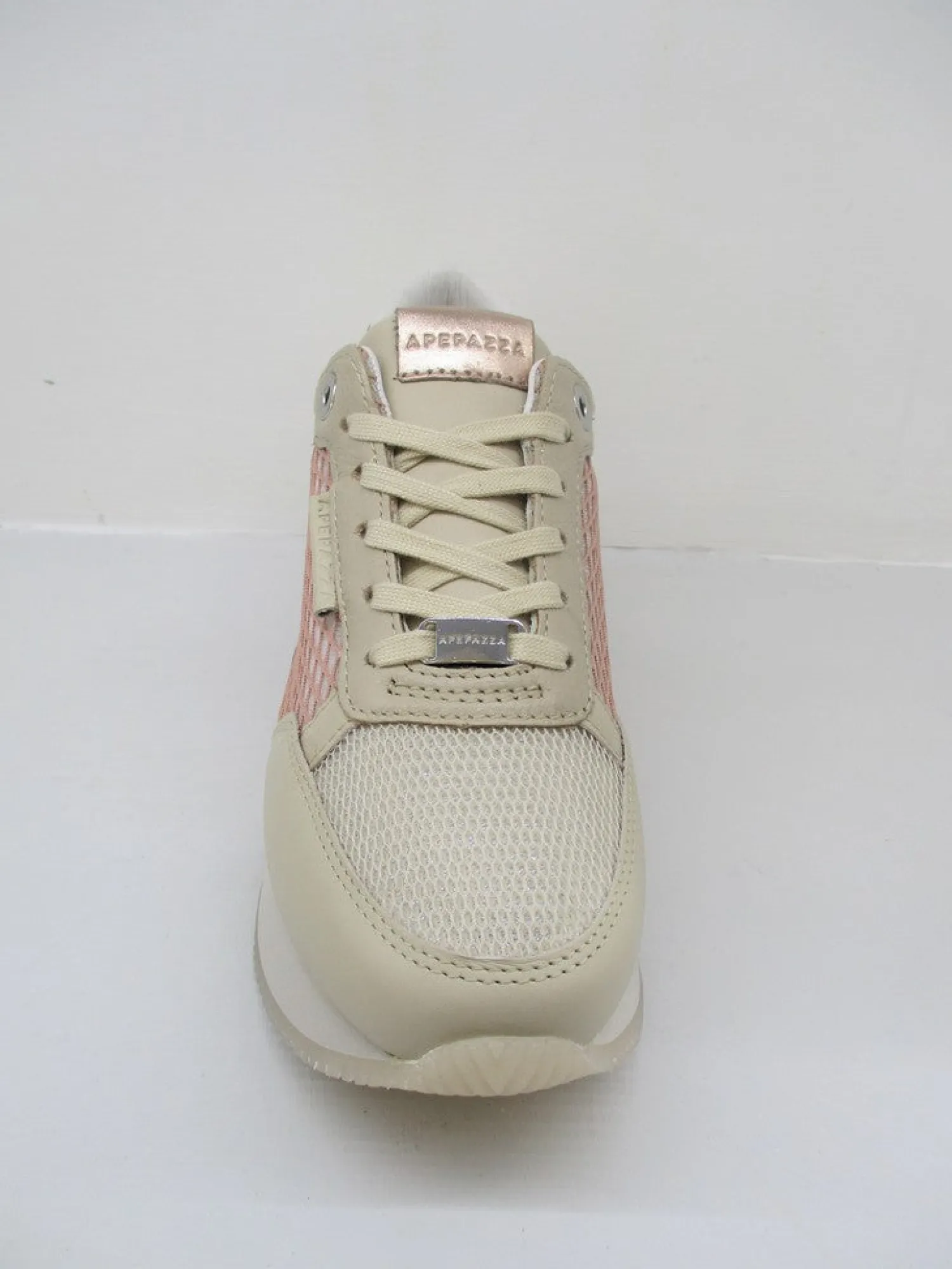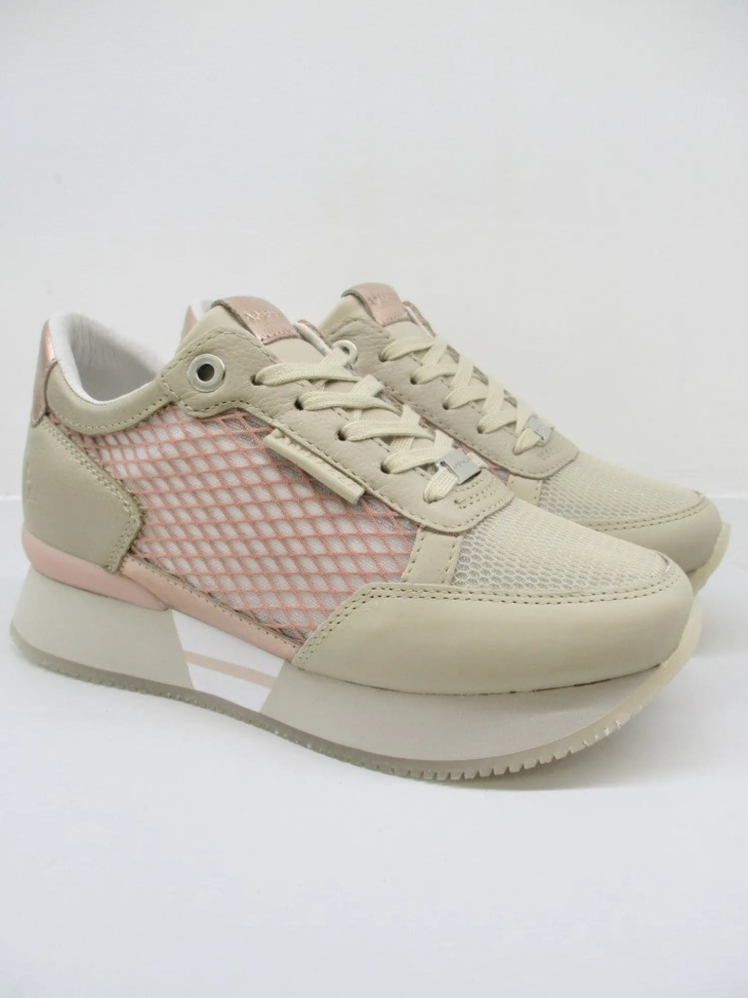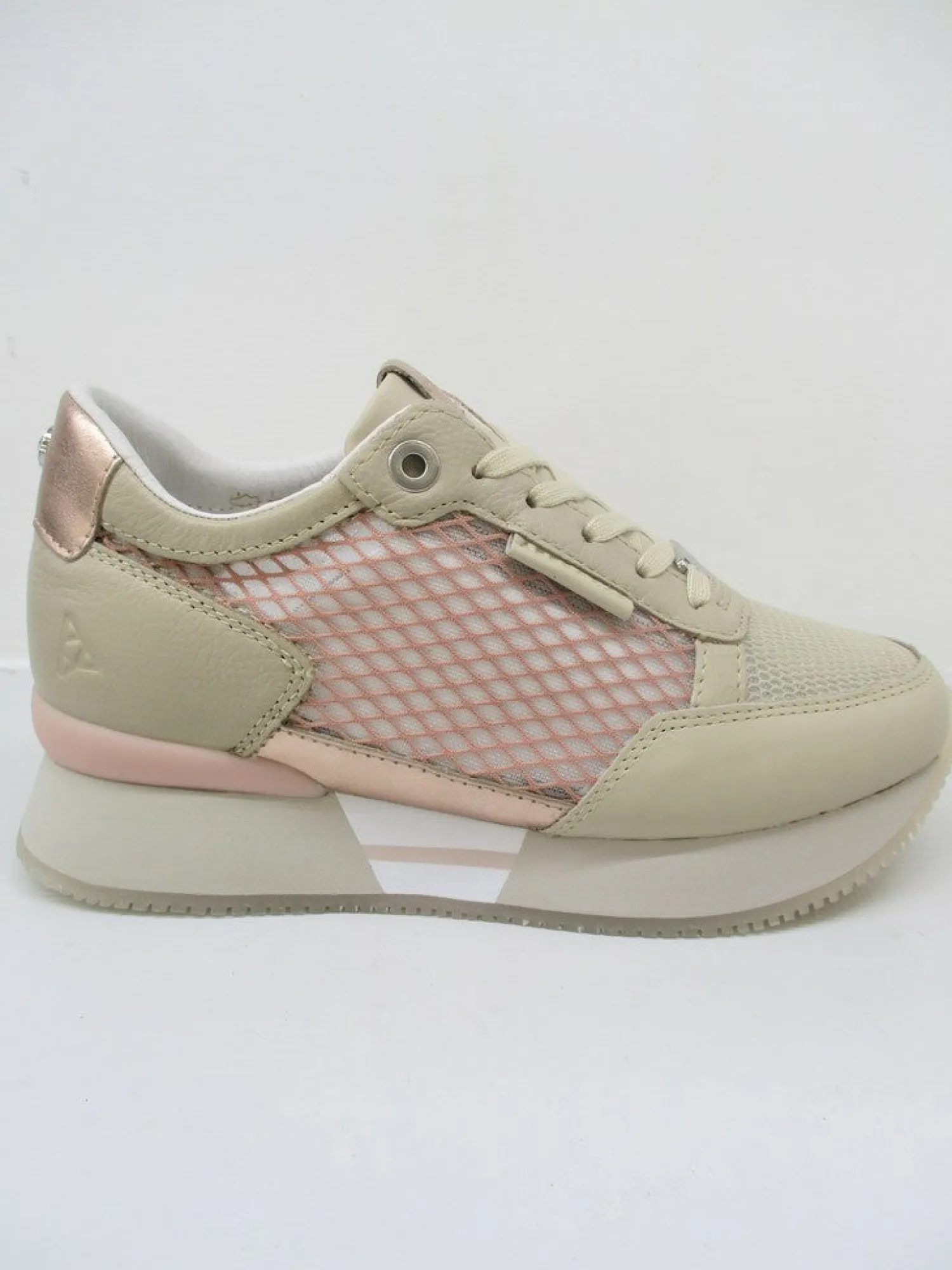 Sneaker in pelle con lacci e rete semi-trasparente ai lati e su punta.La soletta interna è removibile con altezza 2 cm e para esterna di 3 cm. Colore cipria.