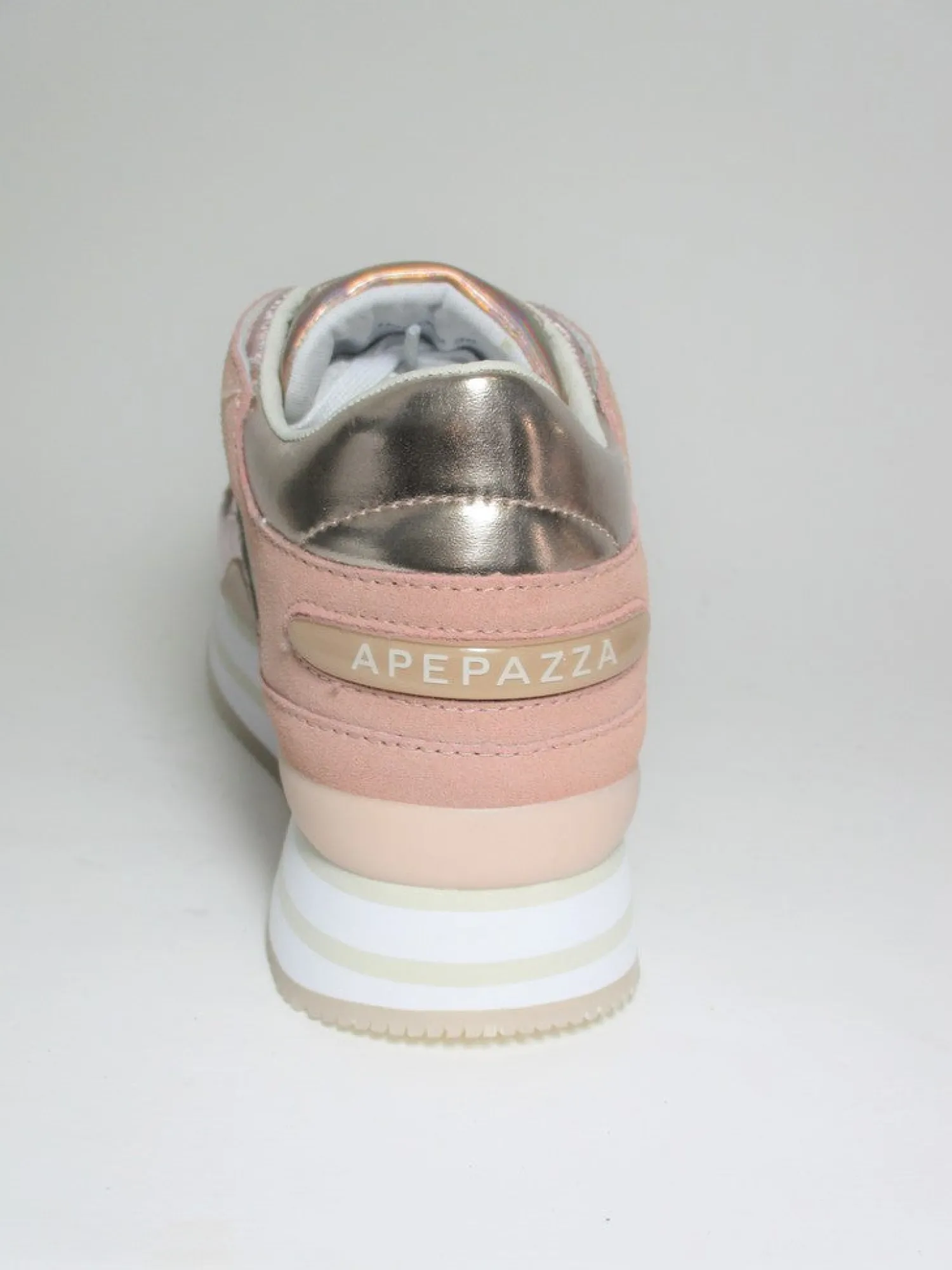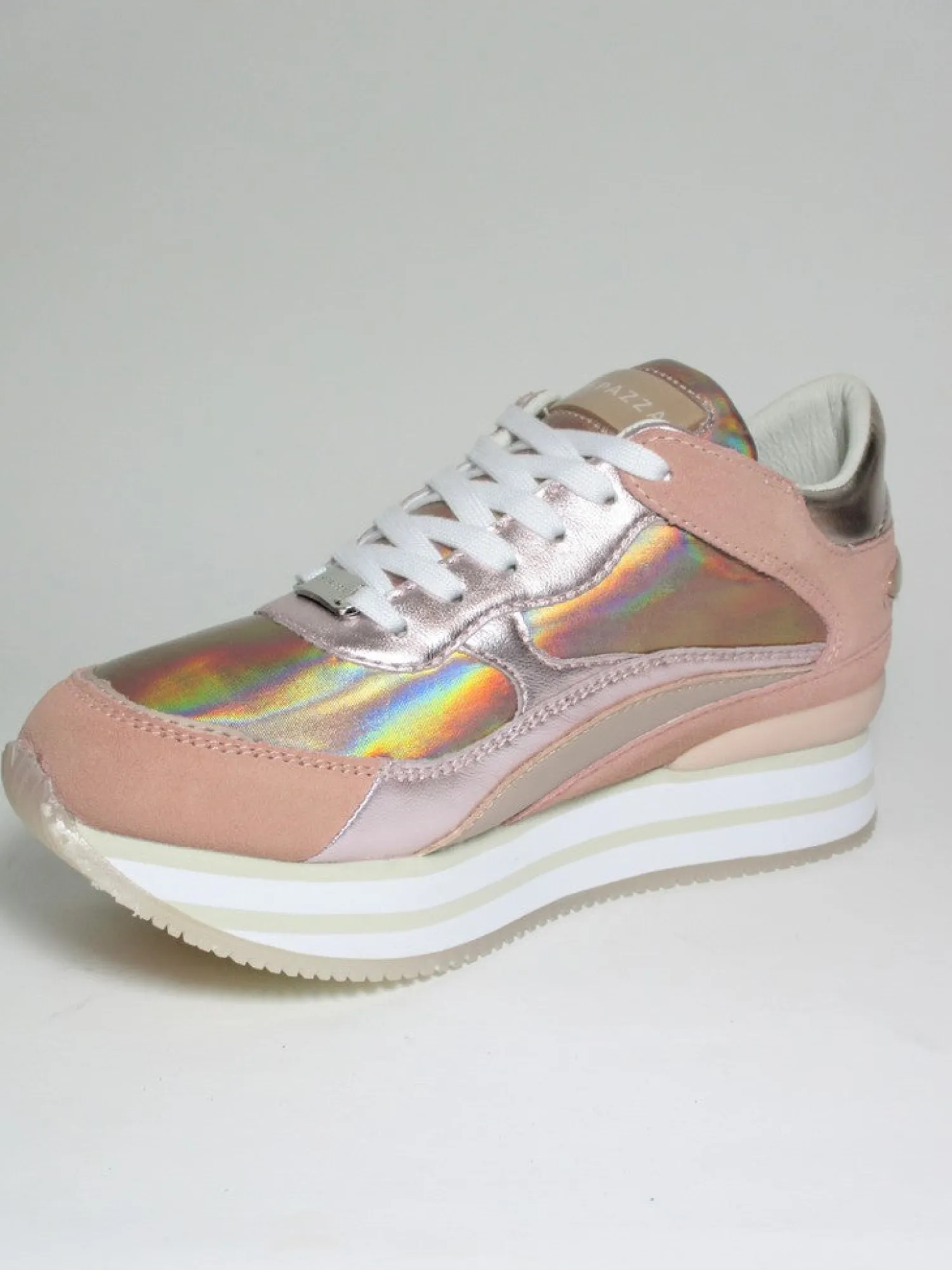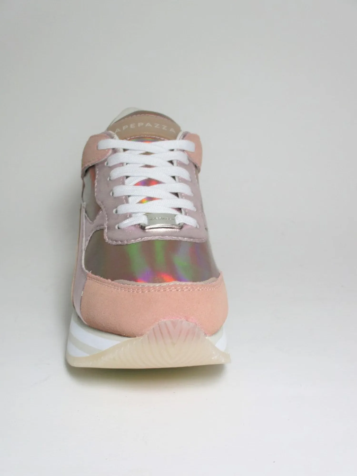 Sneaker sia in pelle che camoscio con lacci .La soletta interna è removibile con altezza 2 cm e la para è di 3 cm. Colore rosa cipria