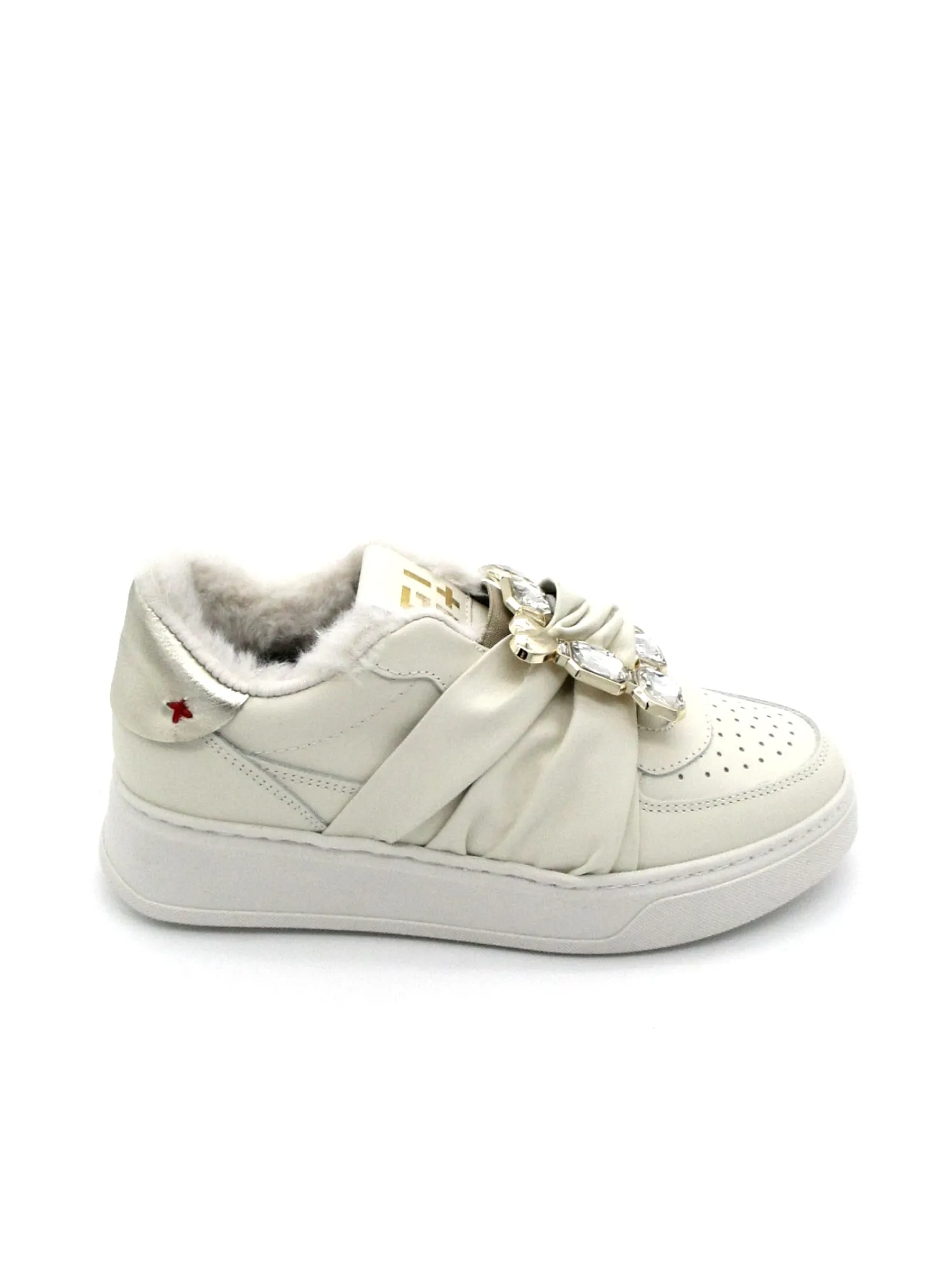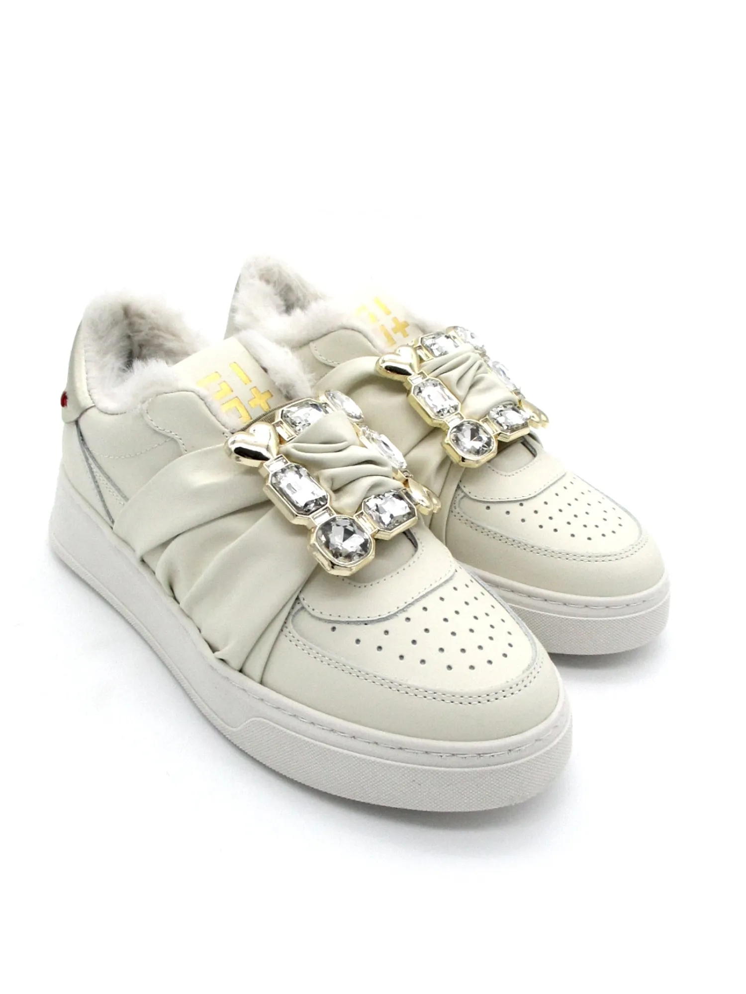 Sneaker donna modello slipon realizzata in pelle color Latte, suola in gomma rialzata di 5 cm per una calzata comoda. Il pratico plantare interno è in pelle ed estraibile. Applicazioni su entrambe i piedi con pietre.