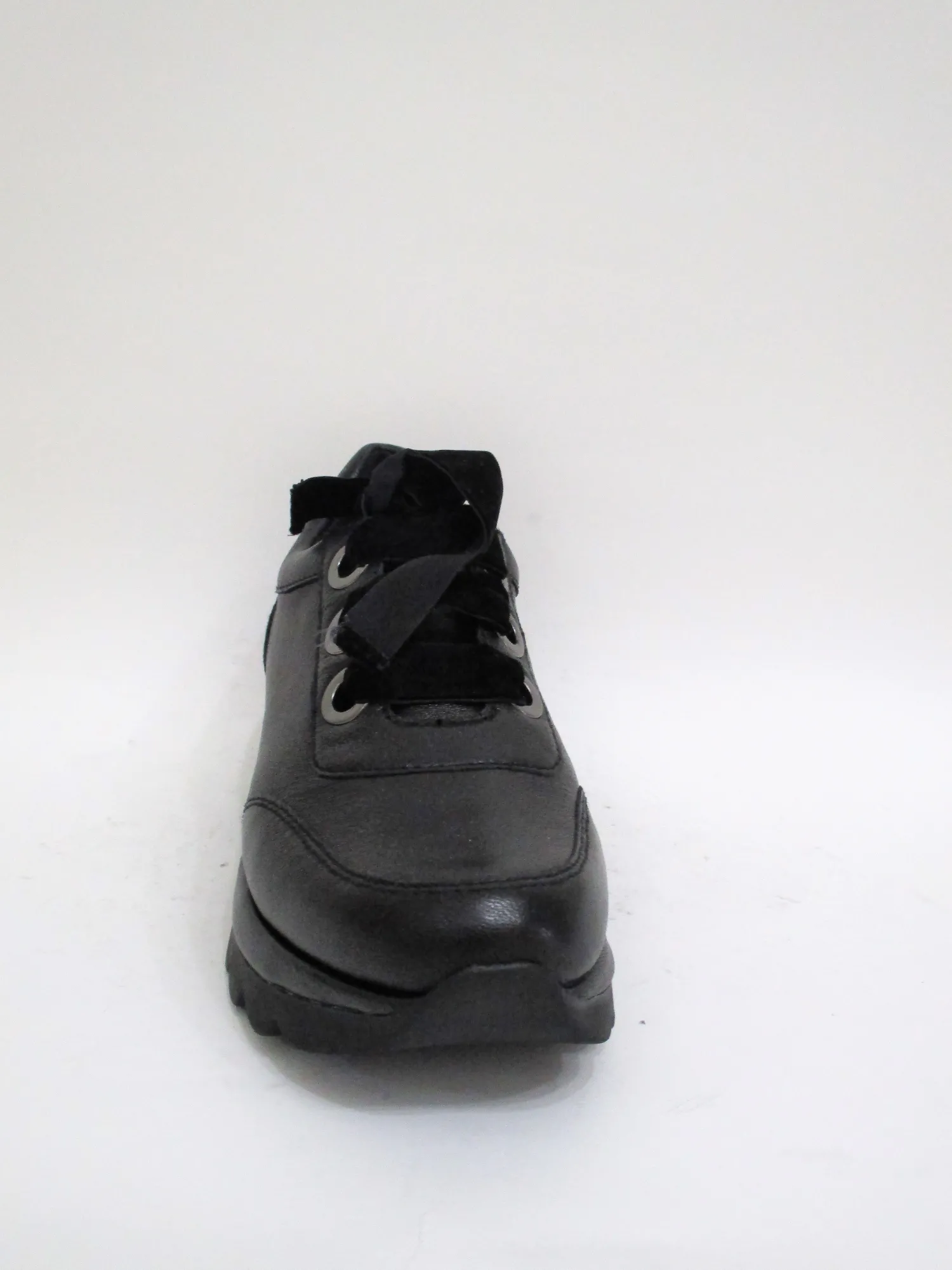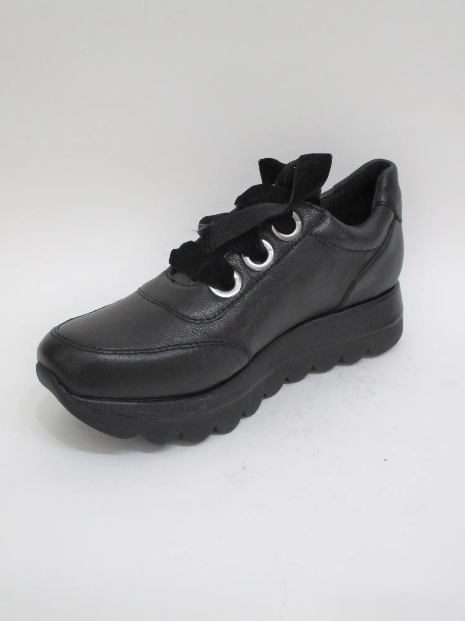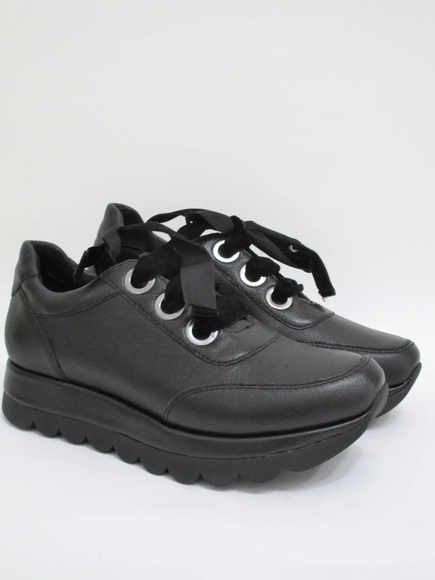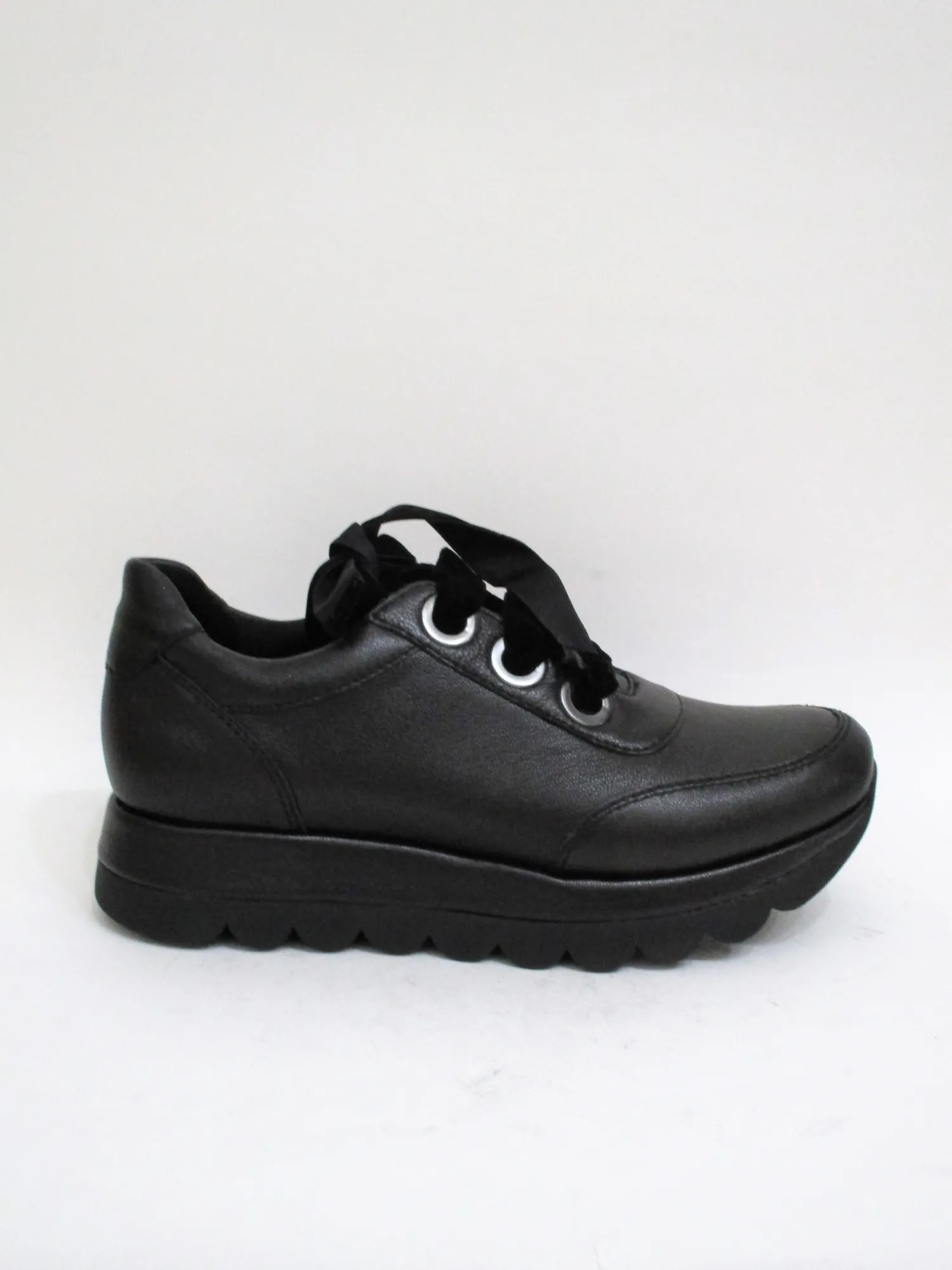 Sneaker donna in pelle laminata con lacci in velluto .Zeppa 4 cm.Colore nero.