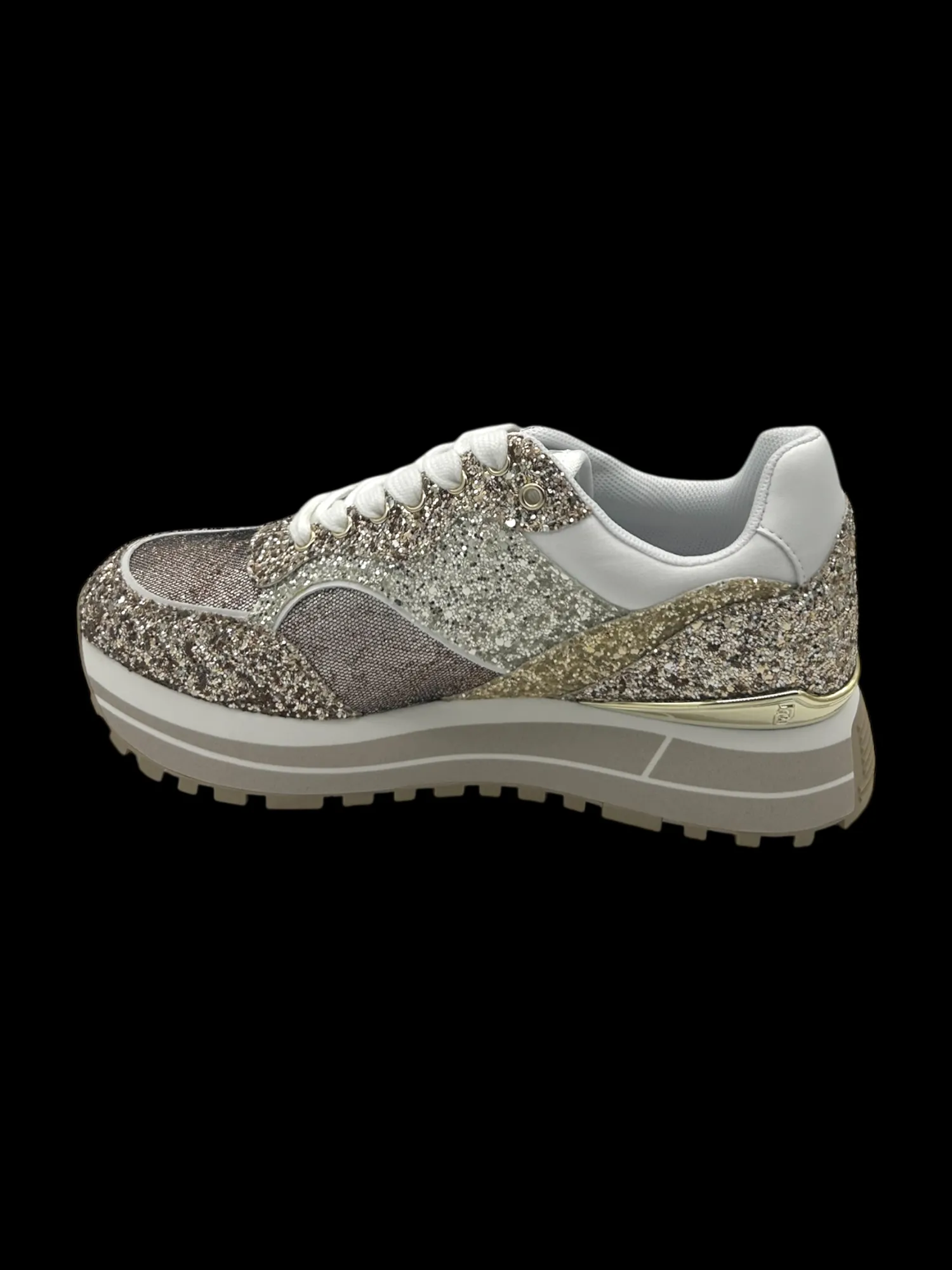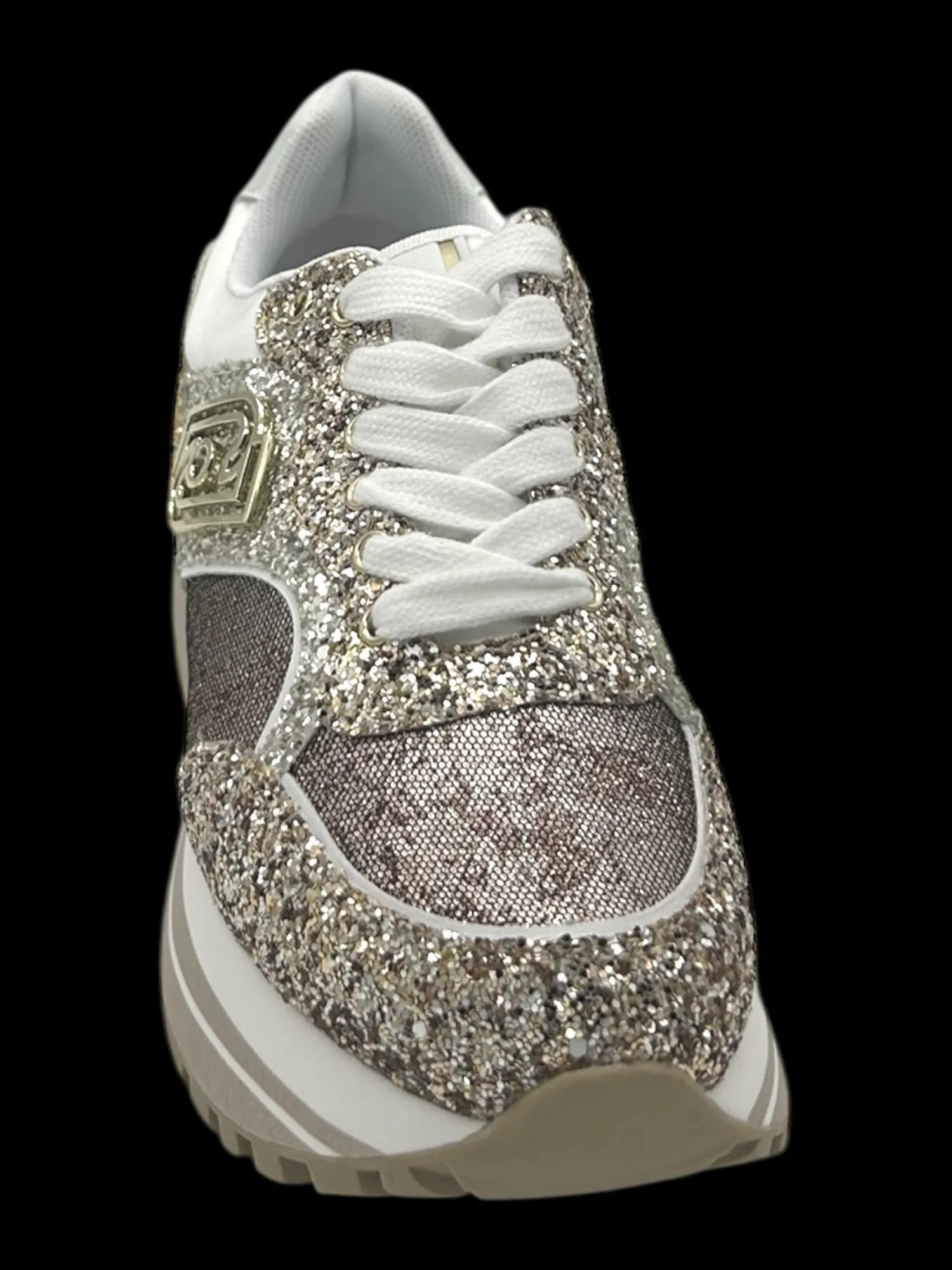 Sneakers con tomaia in Glitter Gold e logo decorativo , altezza suola 5 cm.