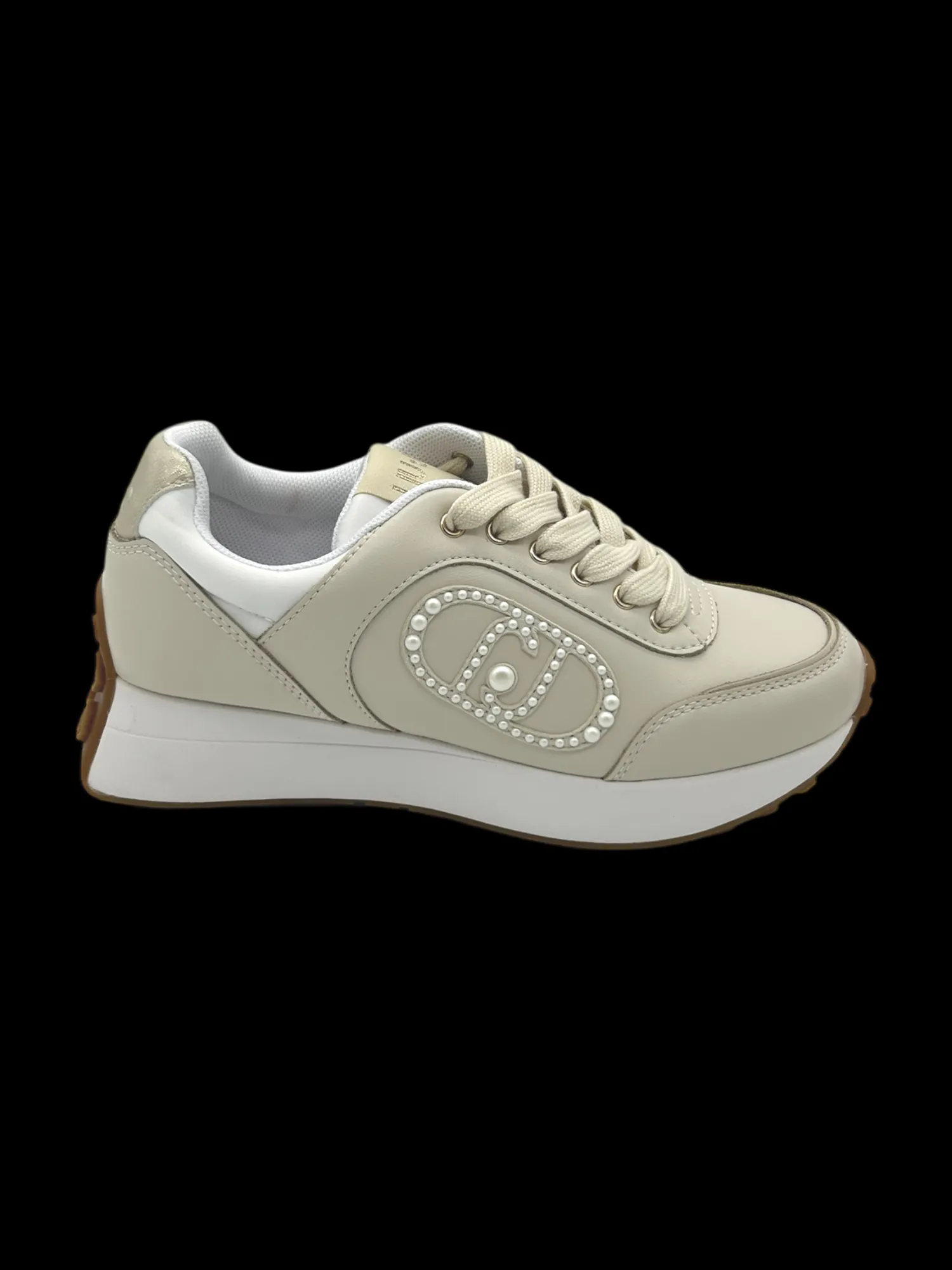 Sneakers con tomaia in pelle Ivory e logo decorativo con perle bianche, altezza suola 5 cm.