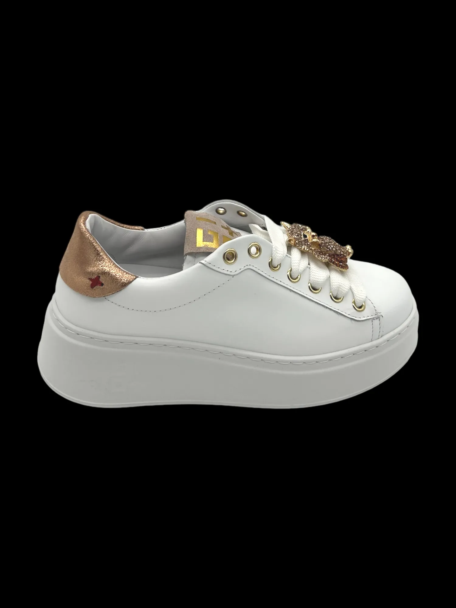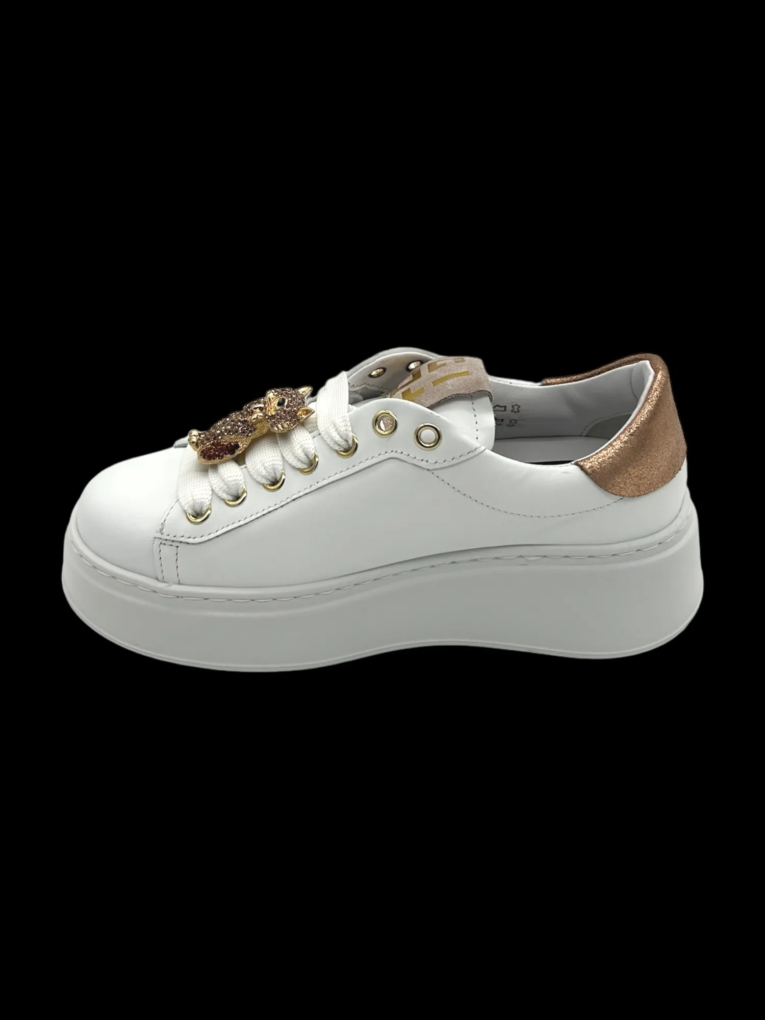 Sneakers donna realizzata in pelle White con decori sui lacci a forma di gatto stilizzato, suola in gomma rialzata di 5 cm per una calzata comoda. Il pratico plantare interno è in pelle ed estraibile. Applicazioni su entrambe i piedi.