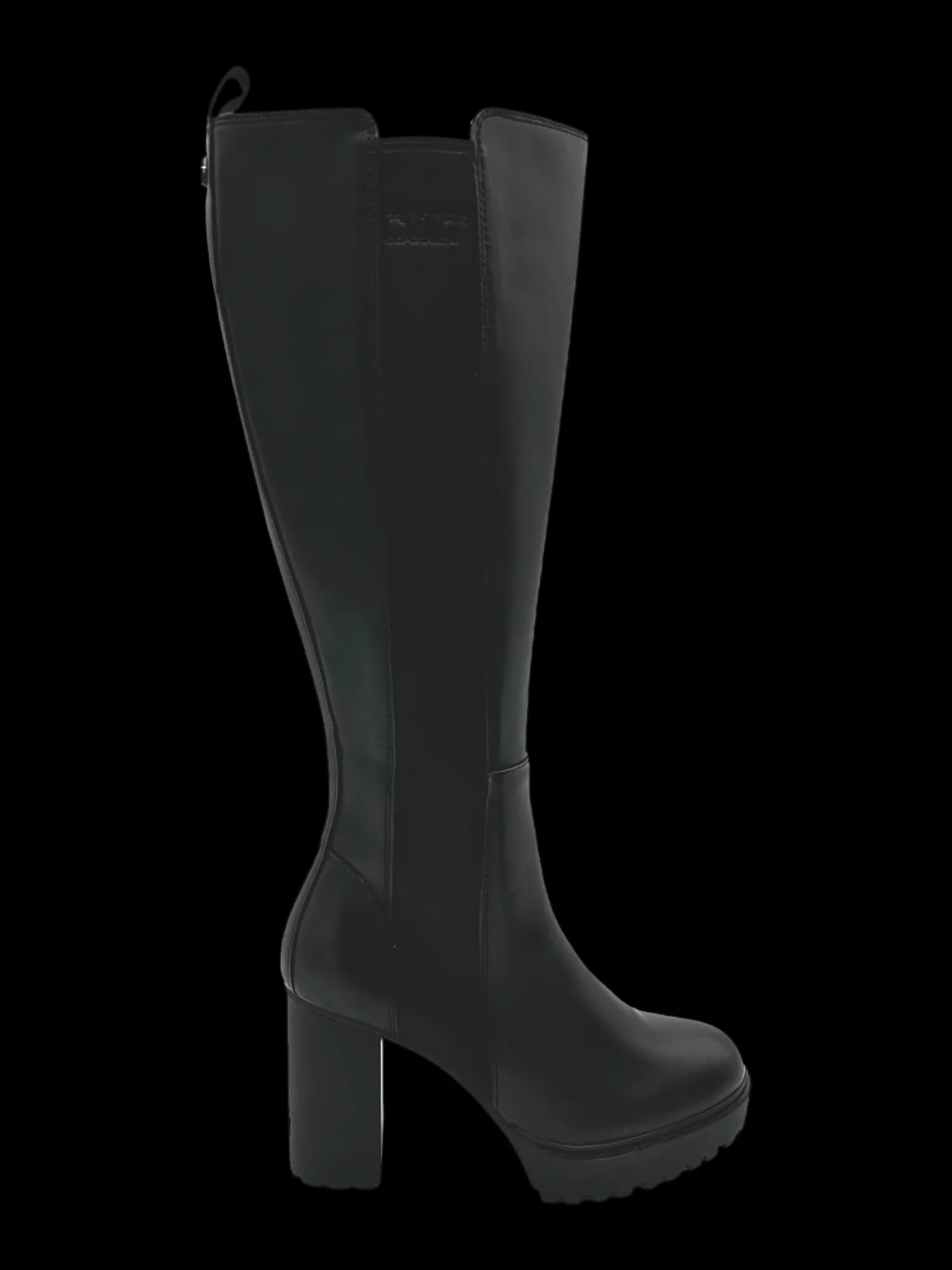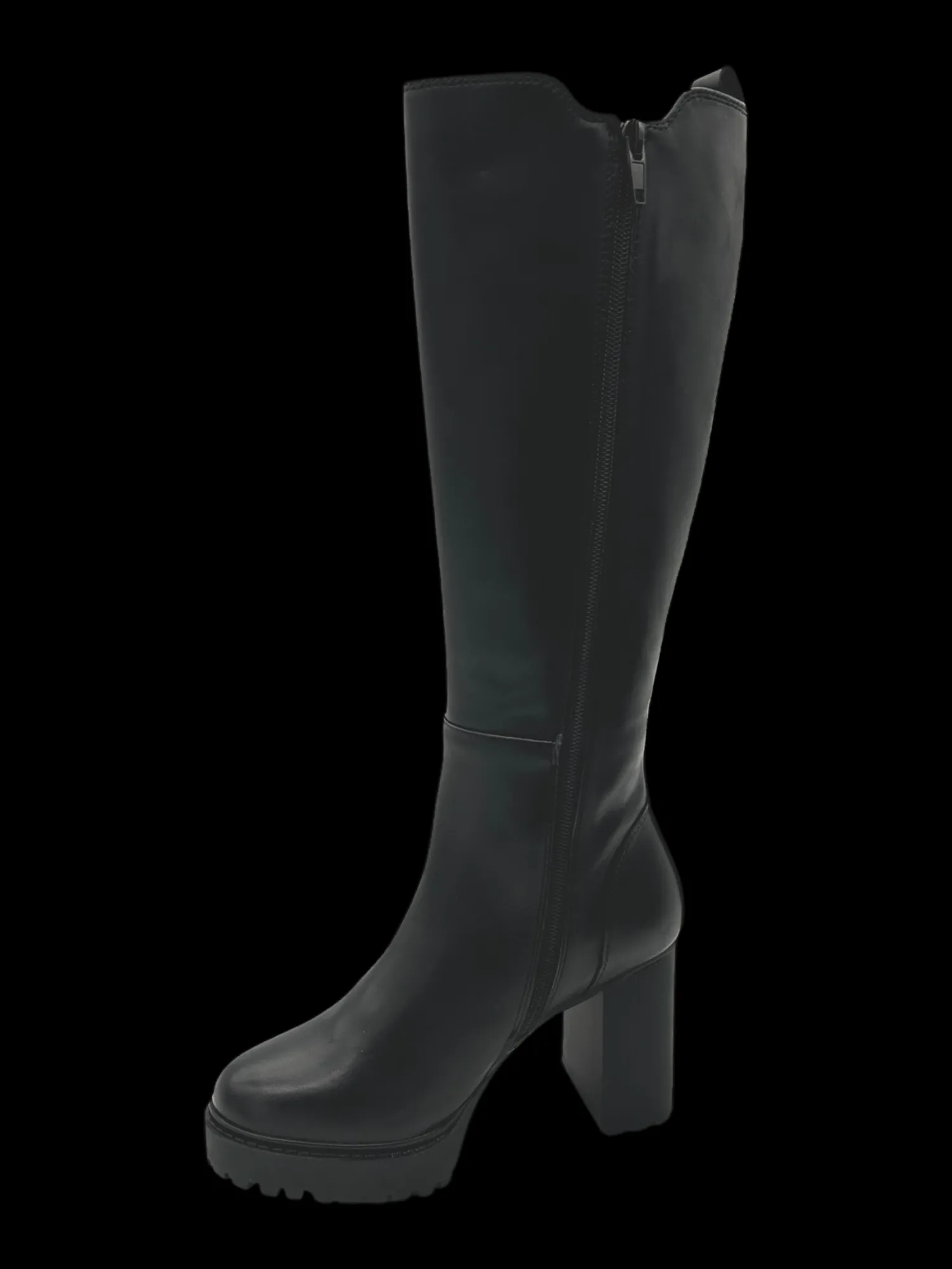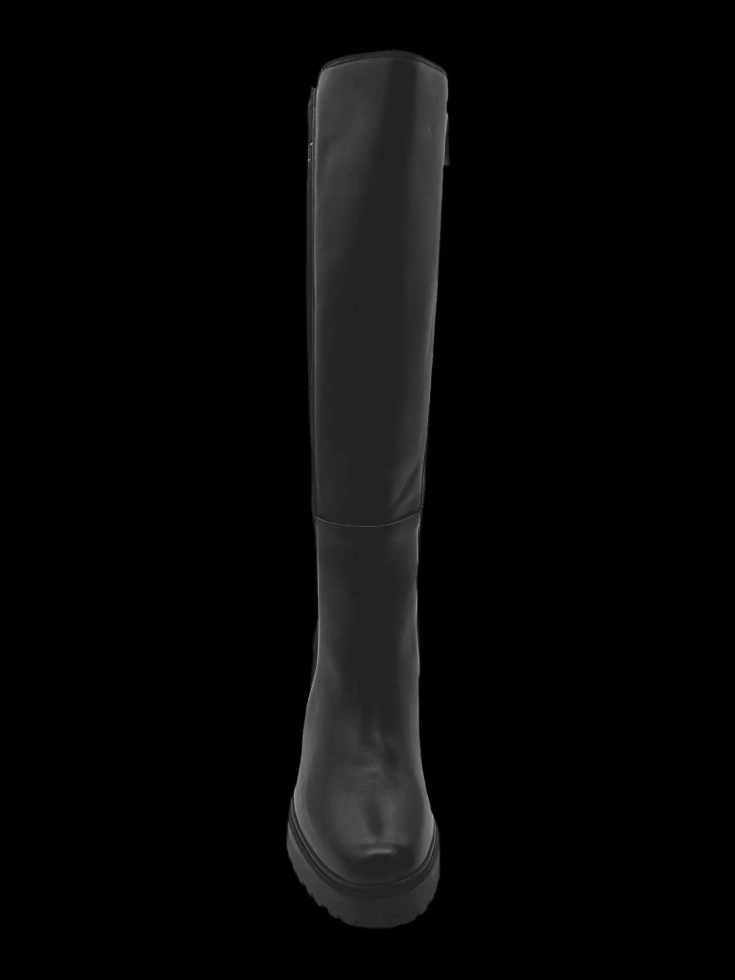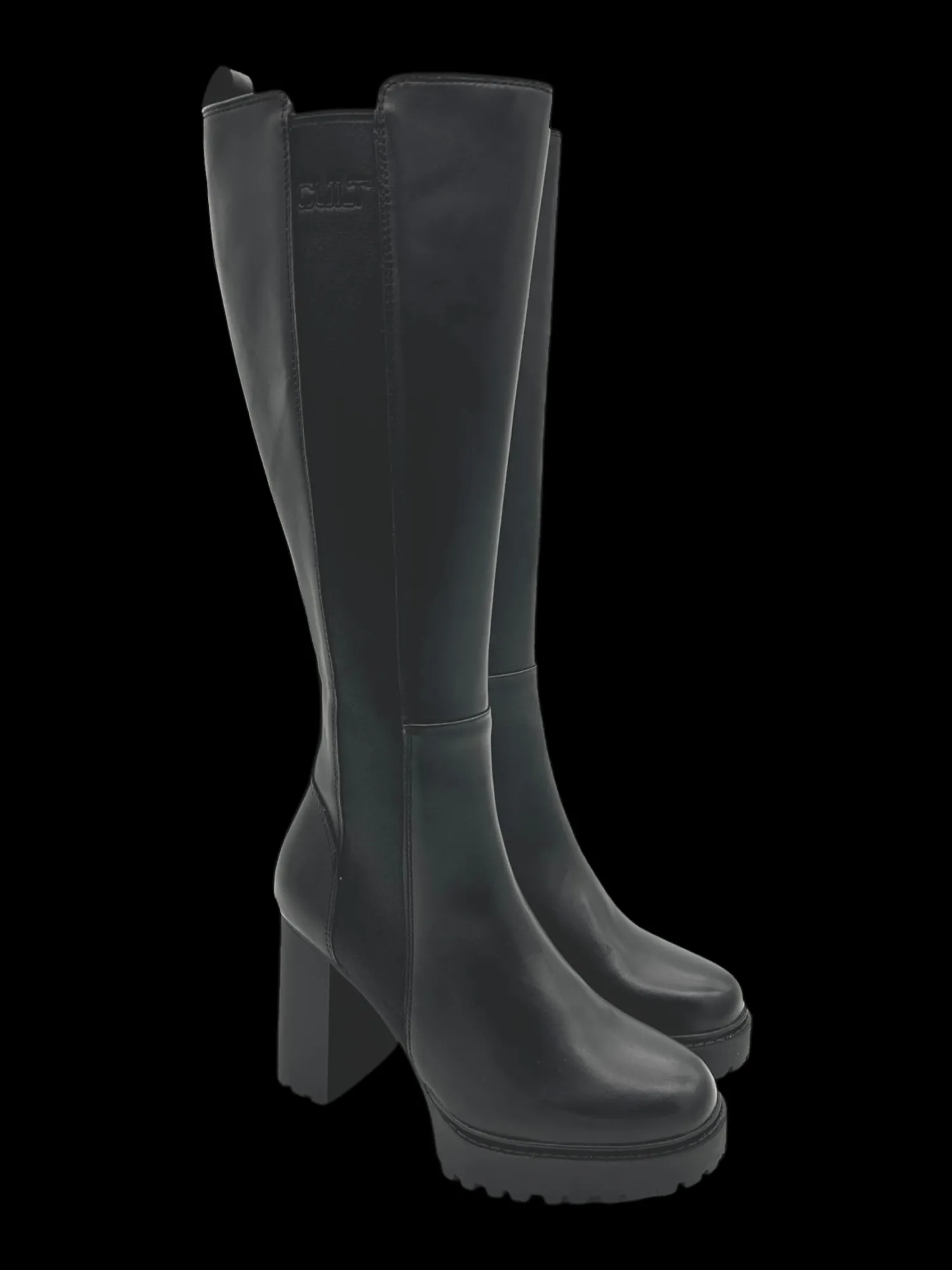 Stivale pelle della famiglia Jagger firmati Cult, in pelle nera con chiusura a zip laterale ed elastico sul gambale per una calzata ancor più comoda, suola rinforzata, altezza 9 cm, plateau 2,5 cm e gambale 36,5 cm.
