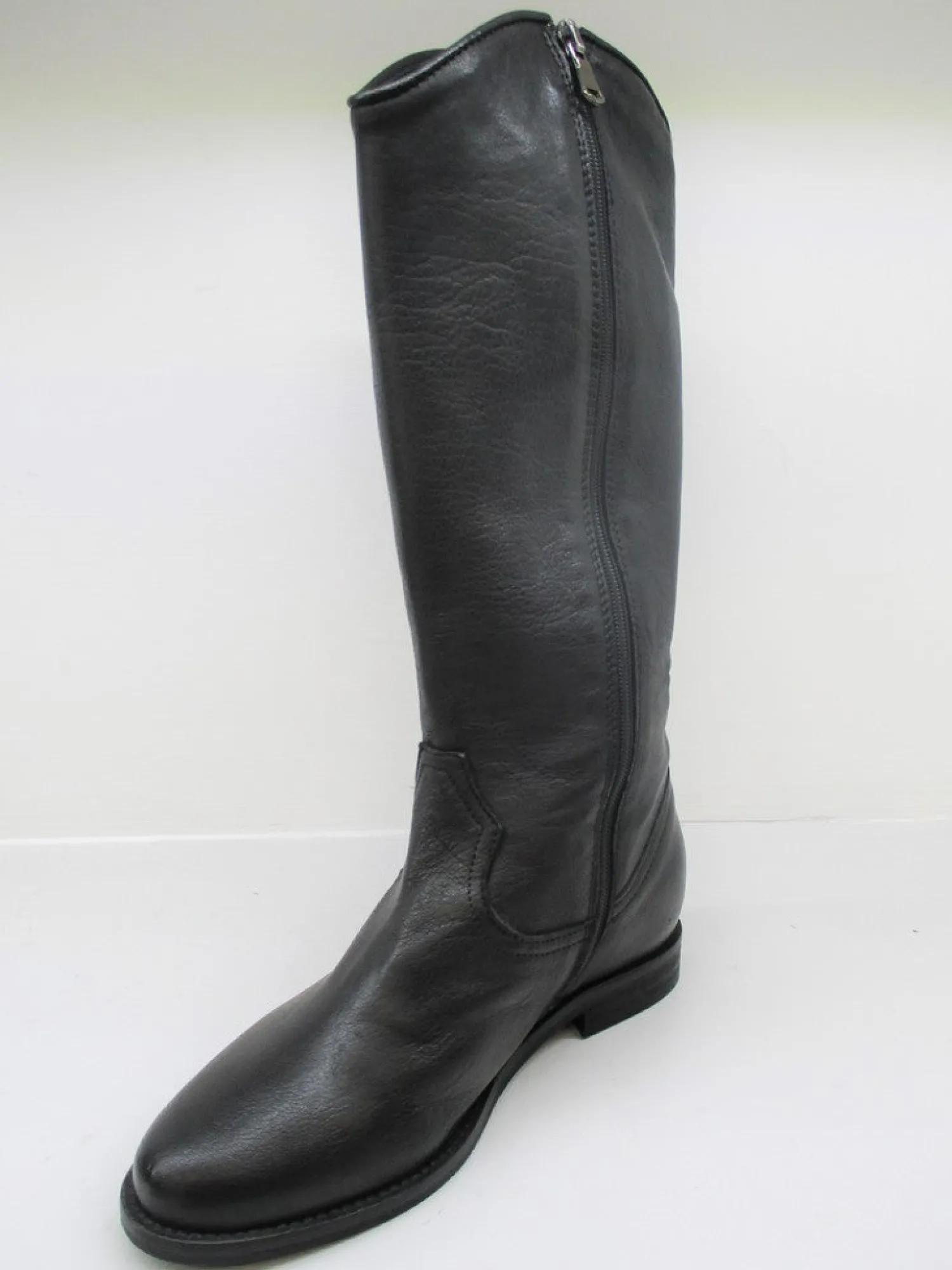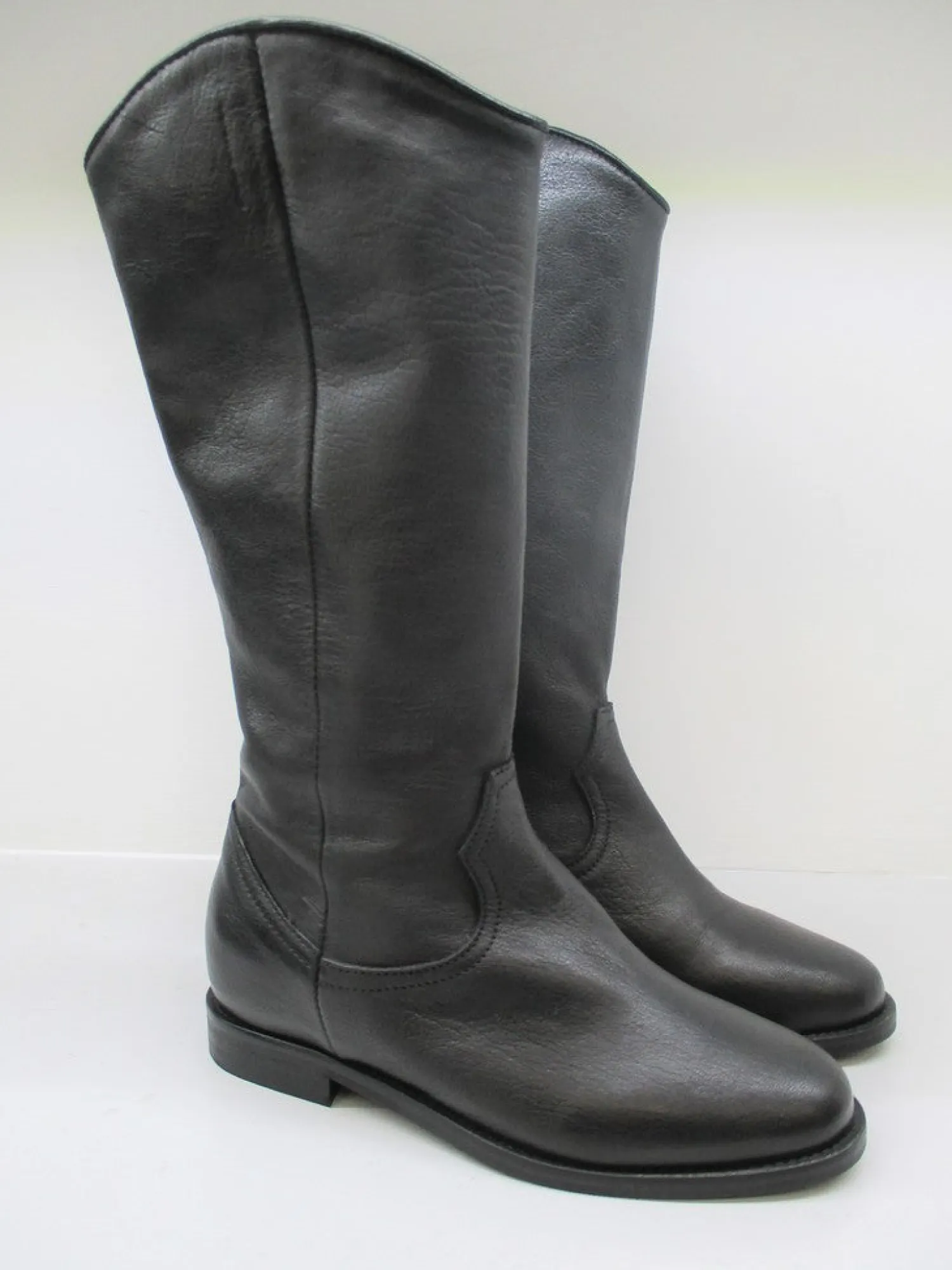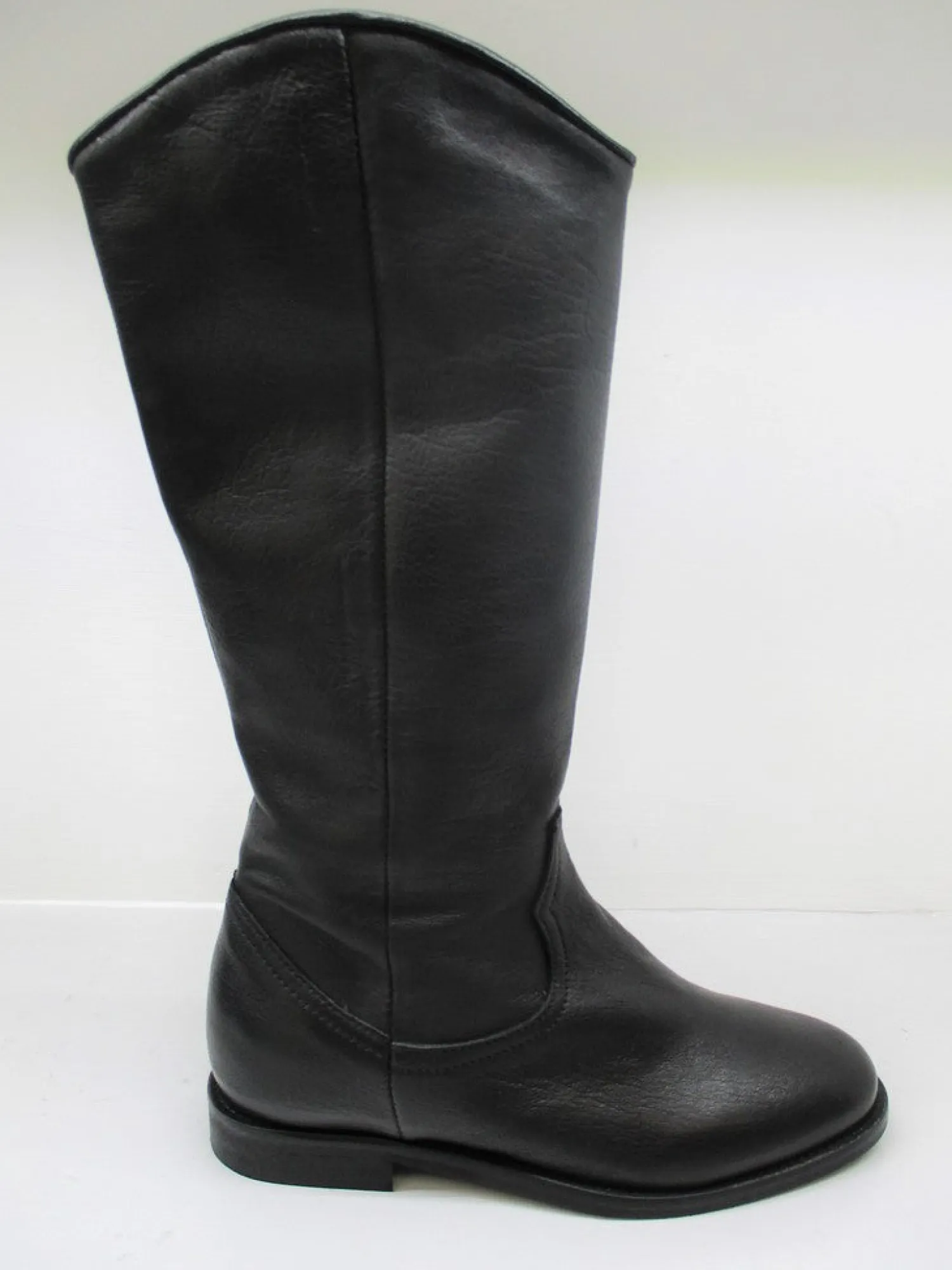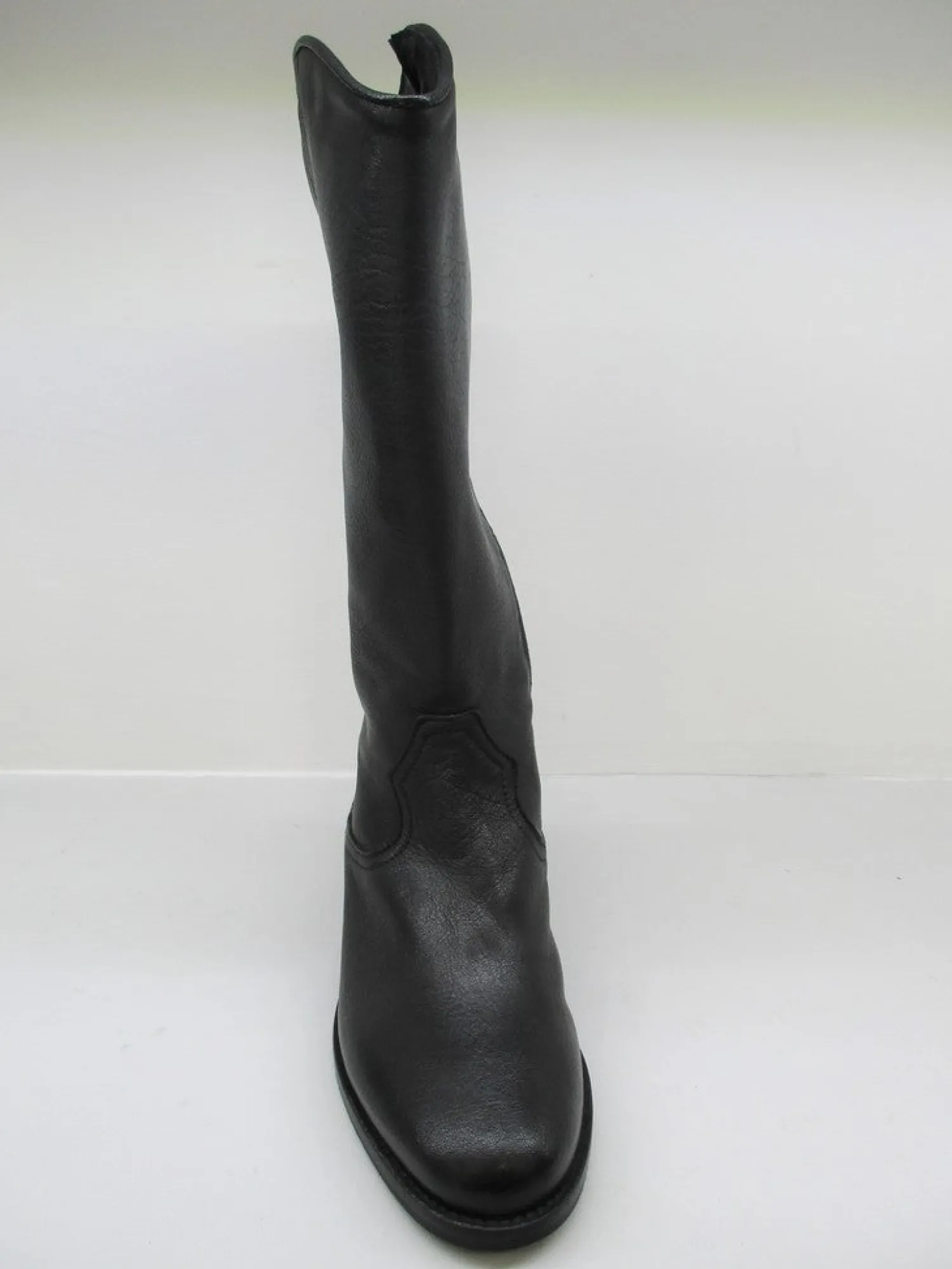 Stivale donna in pelle modello texano , lunghezza gambale al polpaccio con punta arrotondata e zeppa nascosta all’interno (4 cm).Altezza tacco esterno 1,5 cm.Colore nero.