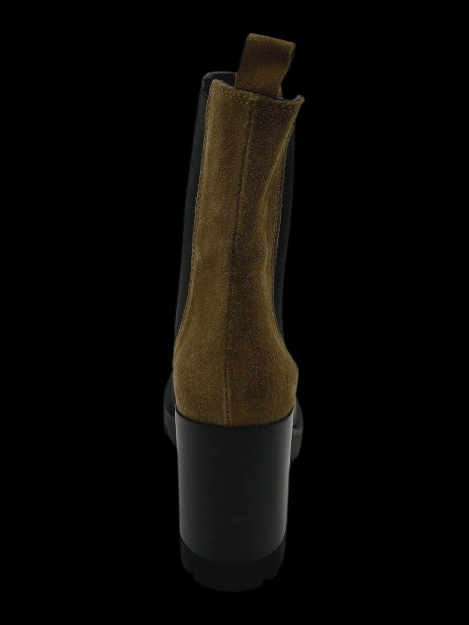 Stivaletto in camoscio color cuoio con comodi elastici laterali, tacco largo di 8 cm. Un tronchetto versatile e comodo da indossare tutto il giorno con qualsiasi look.