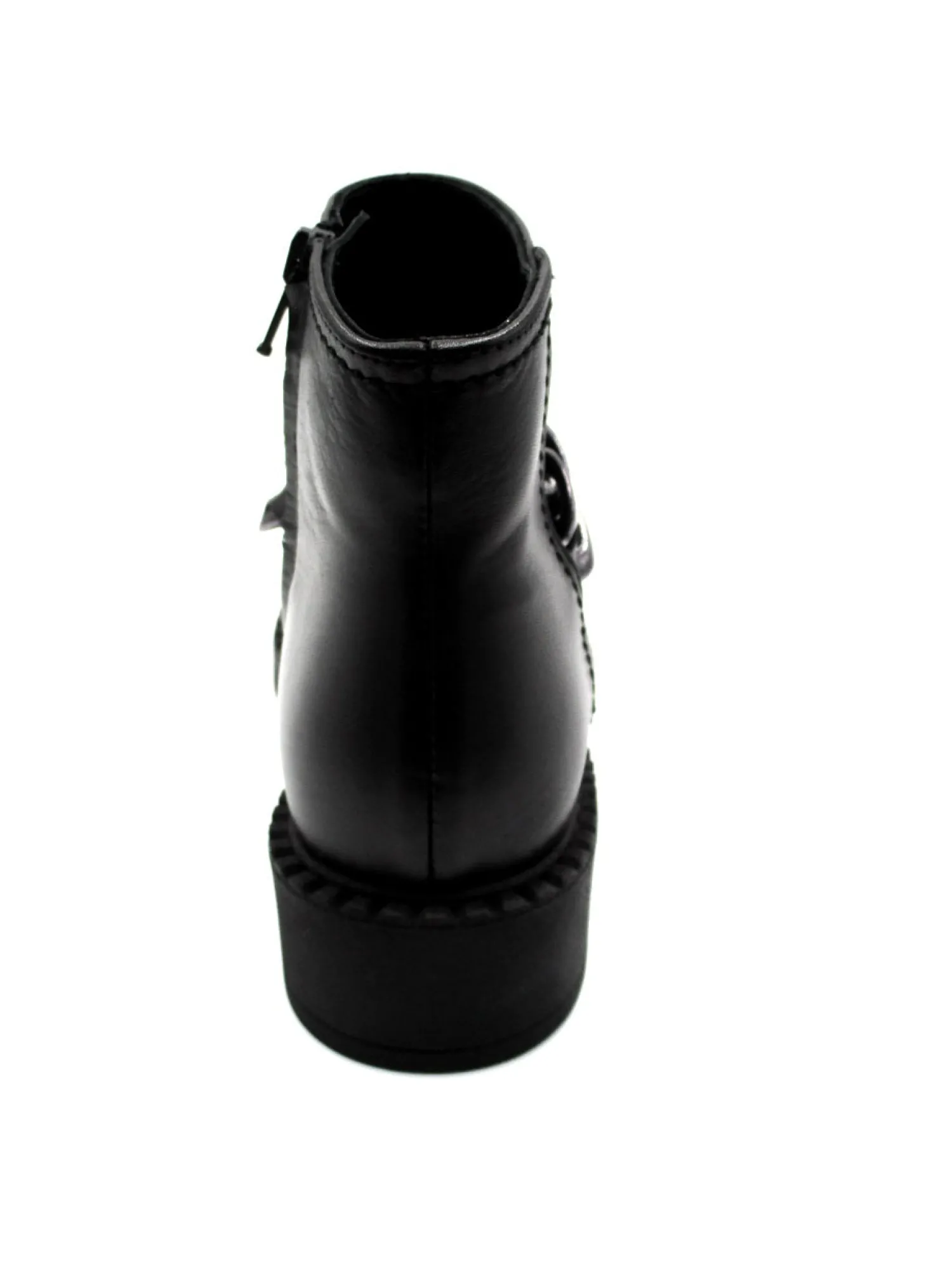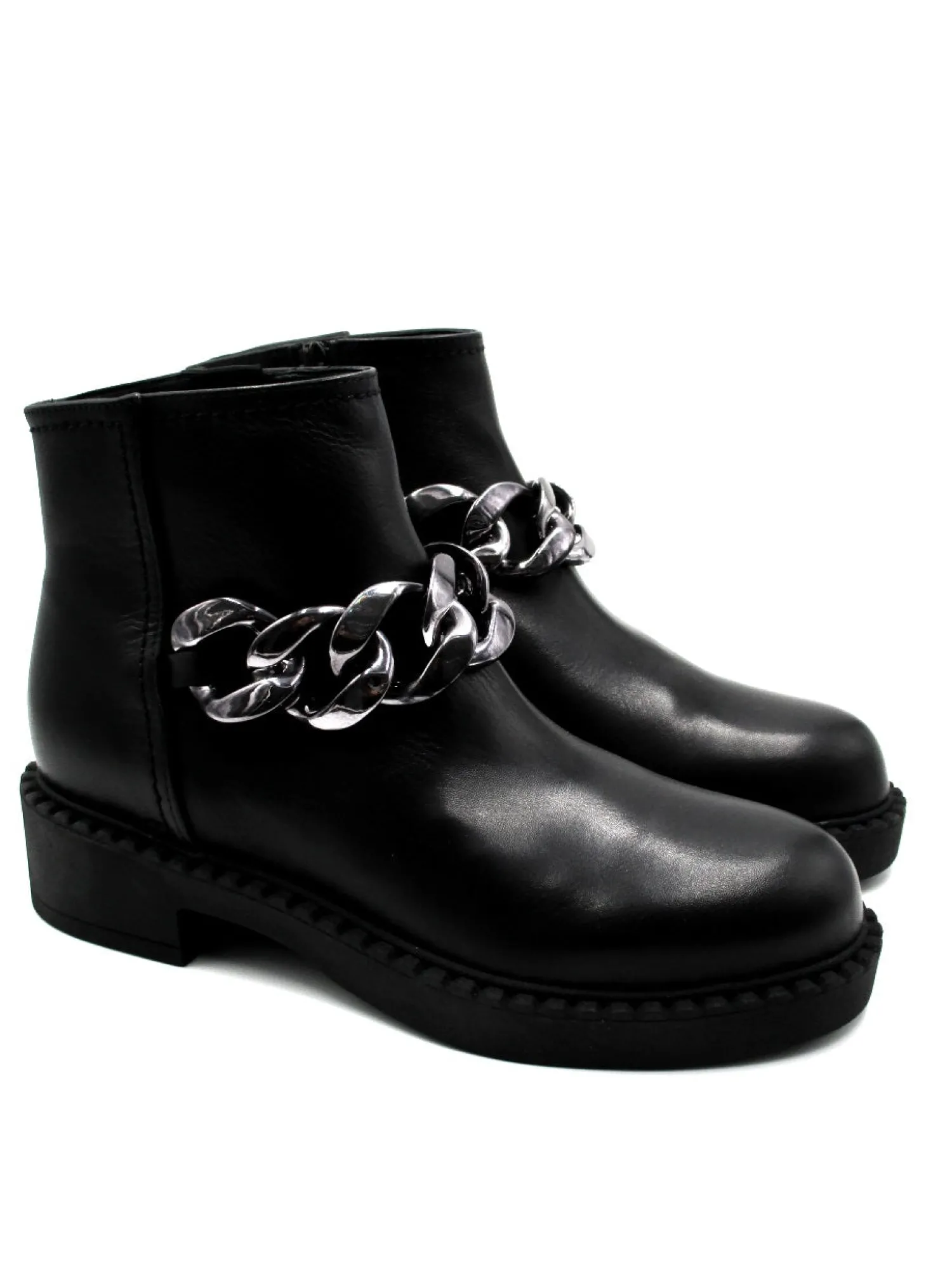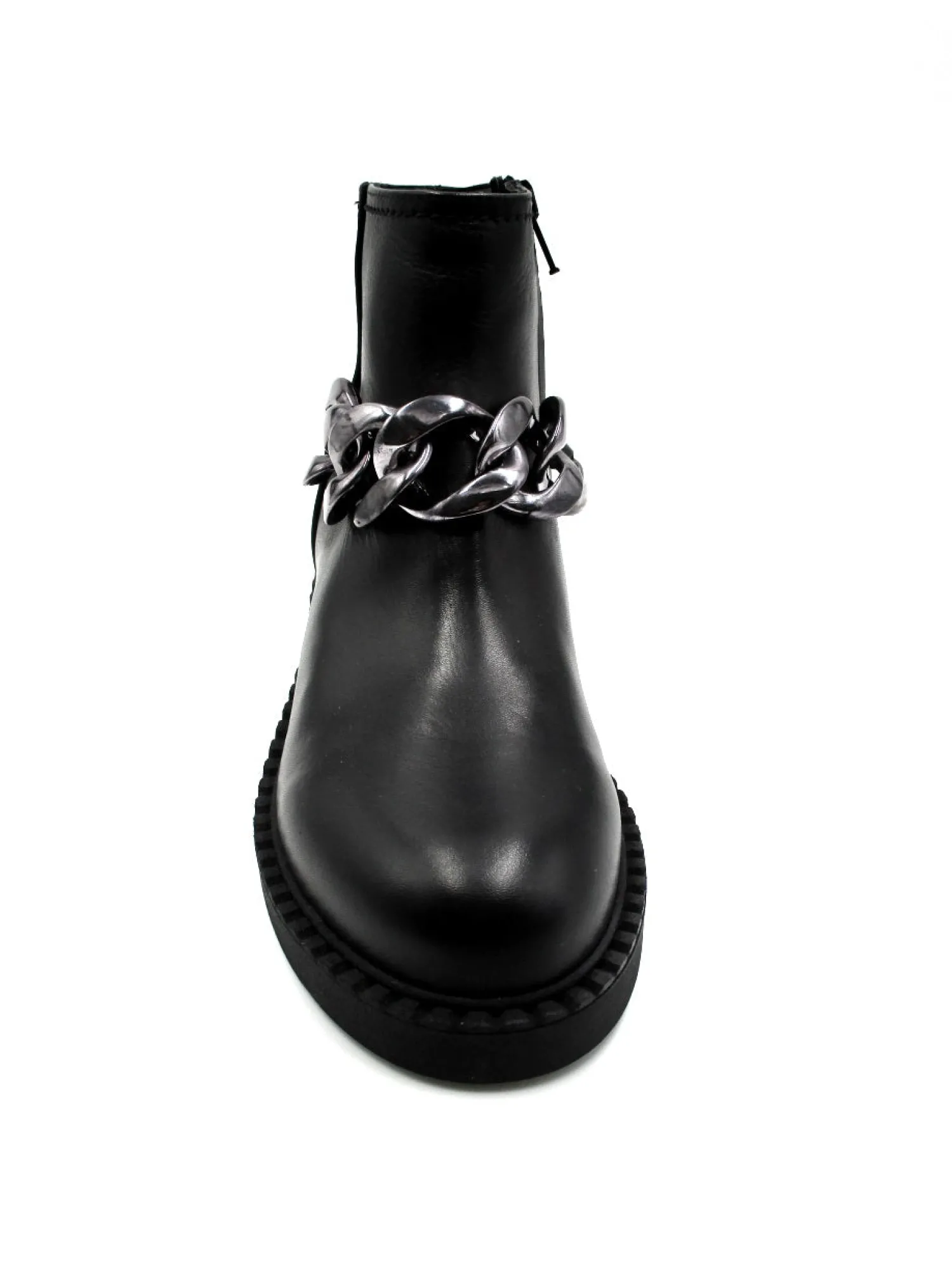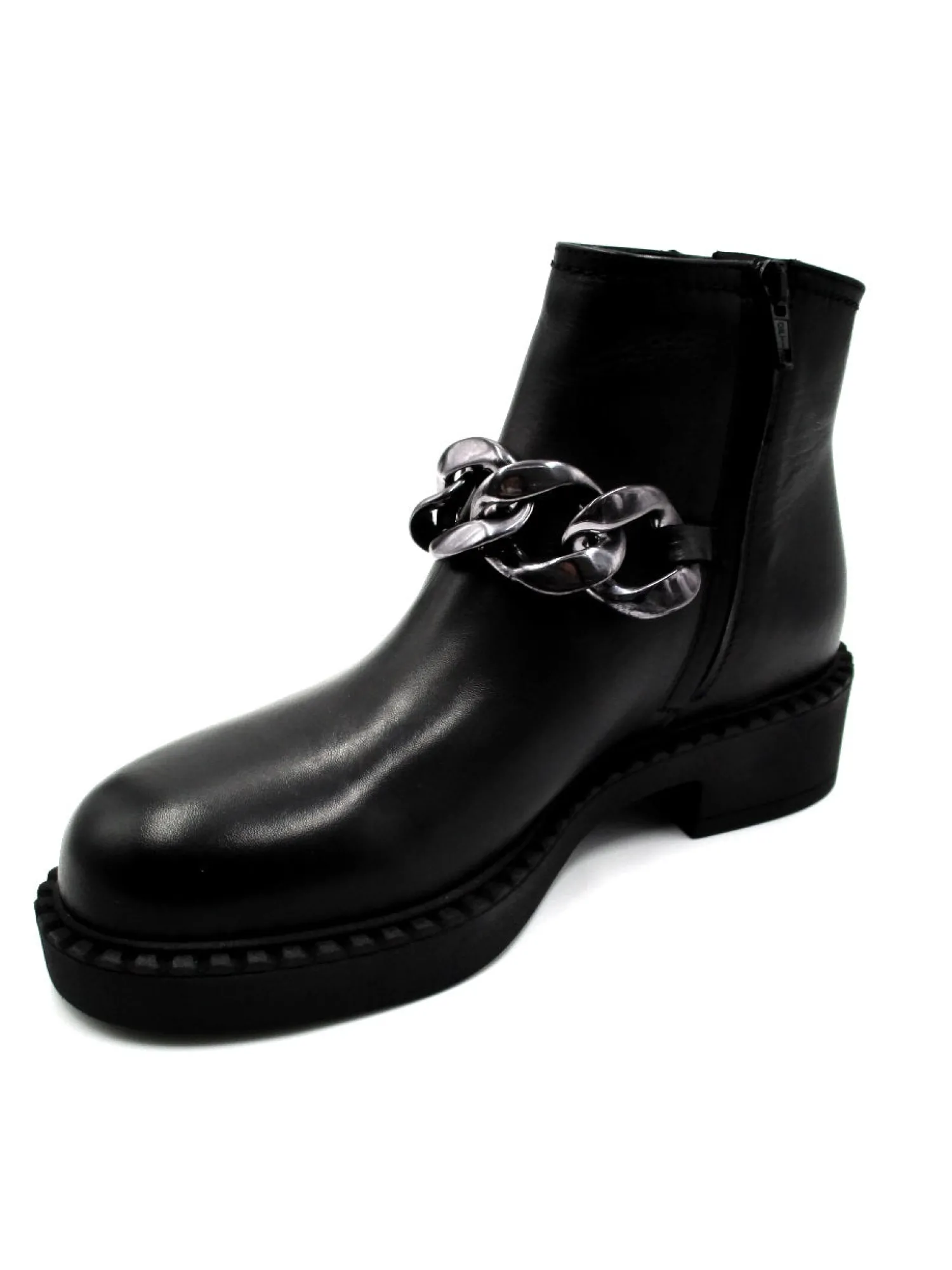 Stivaletto in morbida pelle con lampo laterale, accessorio con catena nichel alla caviglia, fondo in gomma altezza 4 cm colore nero