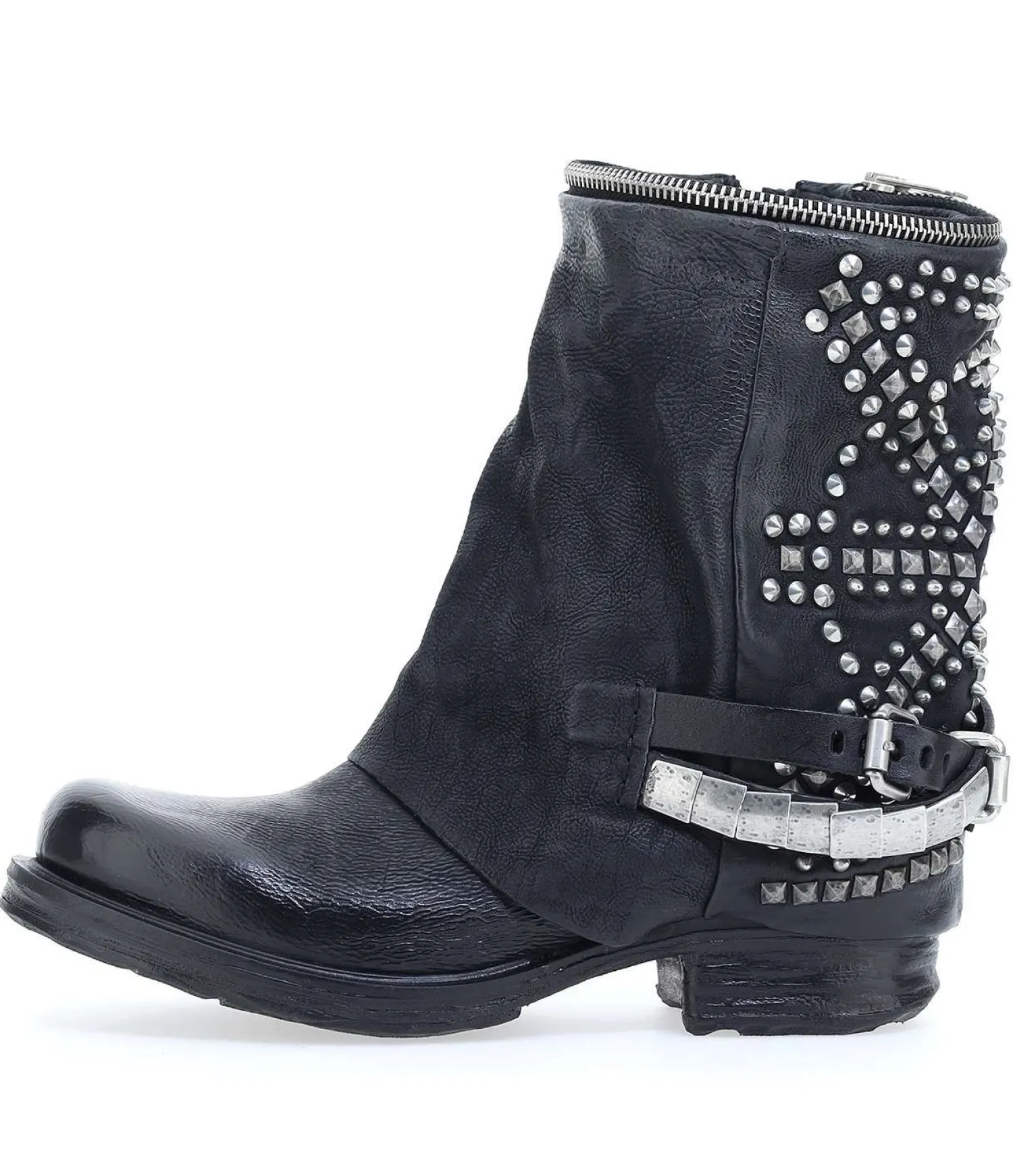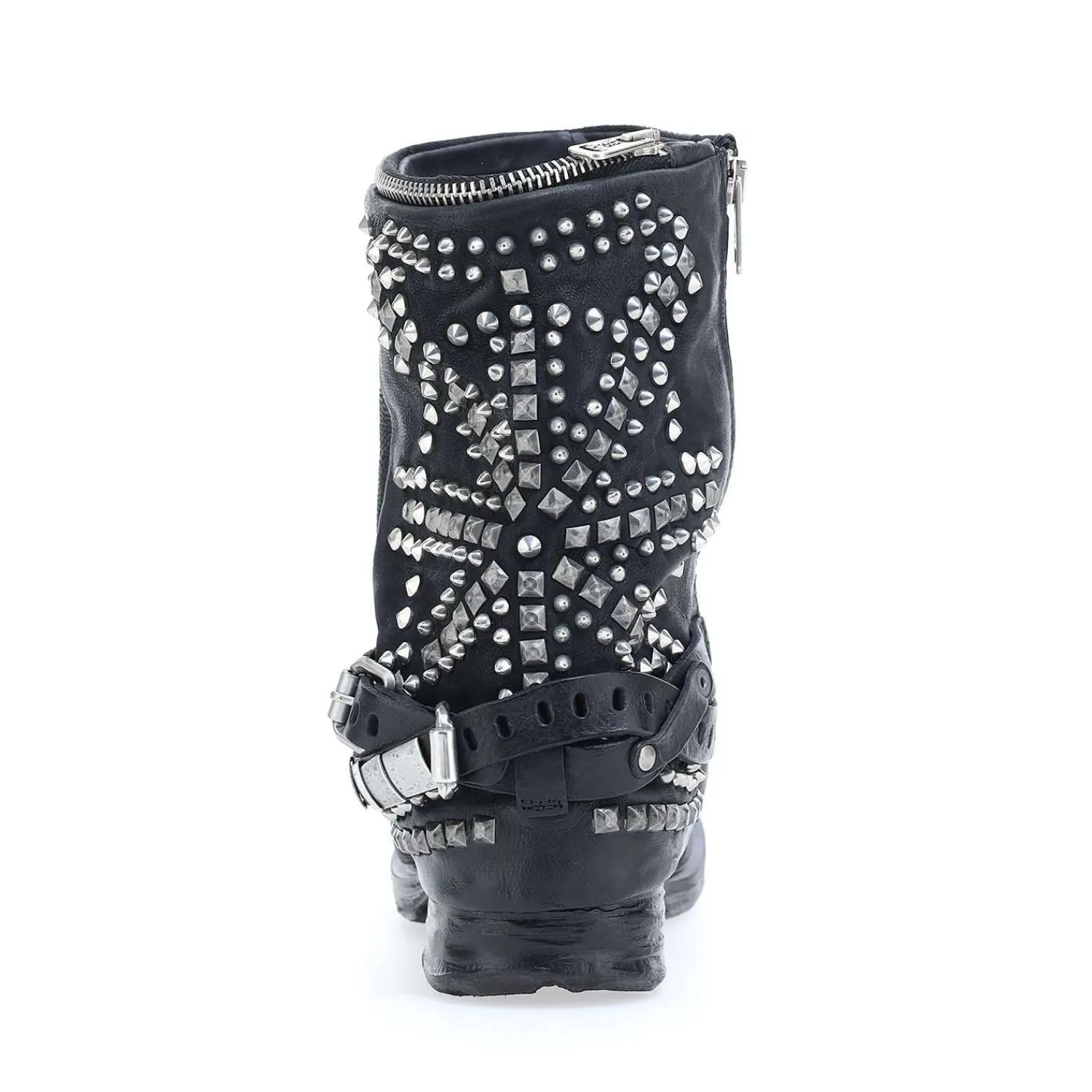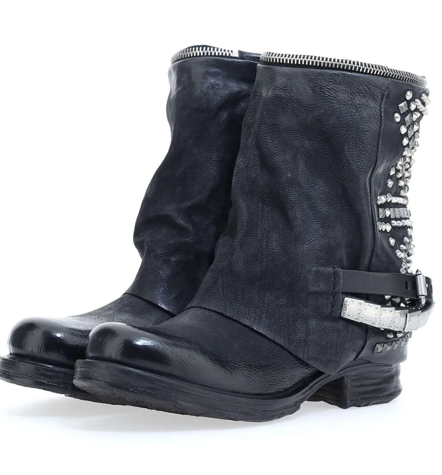 La storica Saintmetal, viene rivista dando al guardolo luce con i rivetti e sposa i classici modelli A.S.98, rielaborati con nuovi temi: baveri con decori etnici, occhielli e borchie importanti. Tacco 3 cm, altezza gambale 18,5 cm.