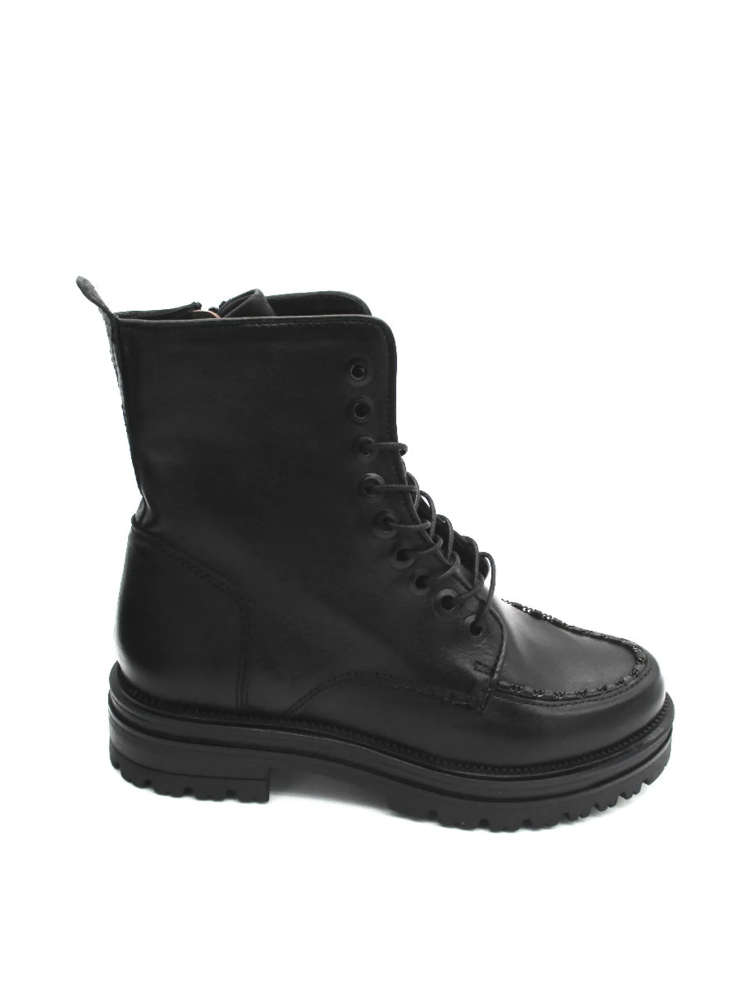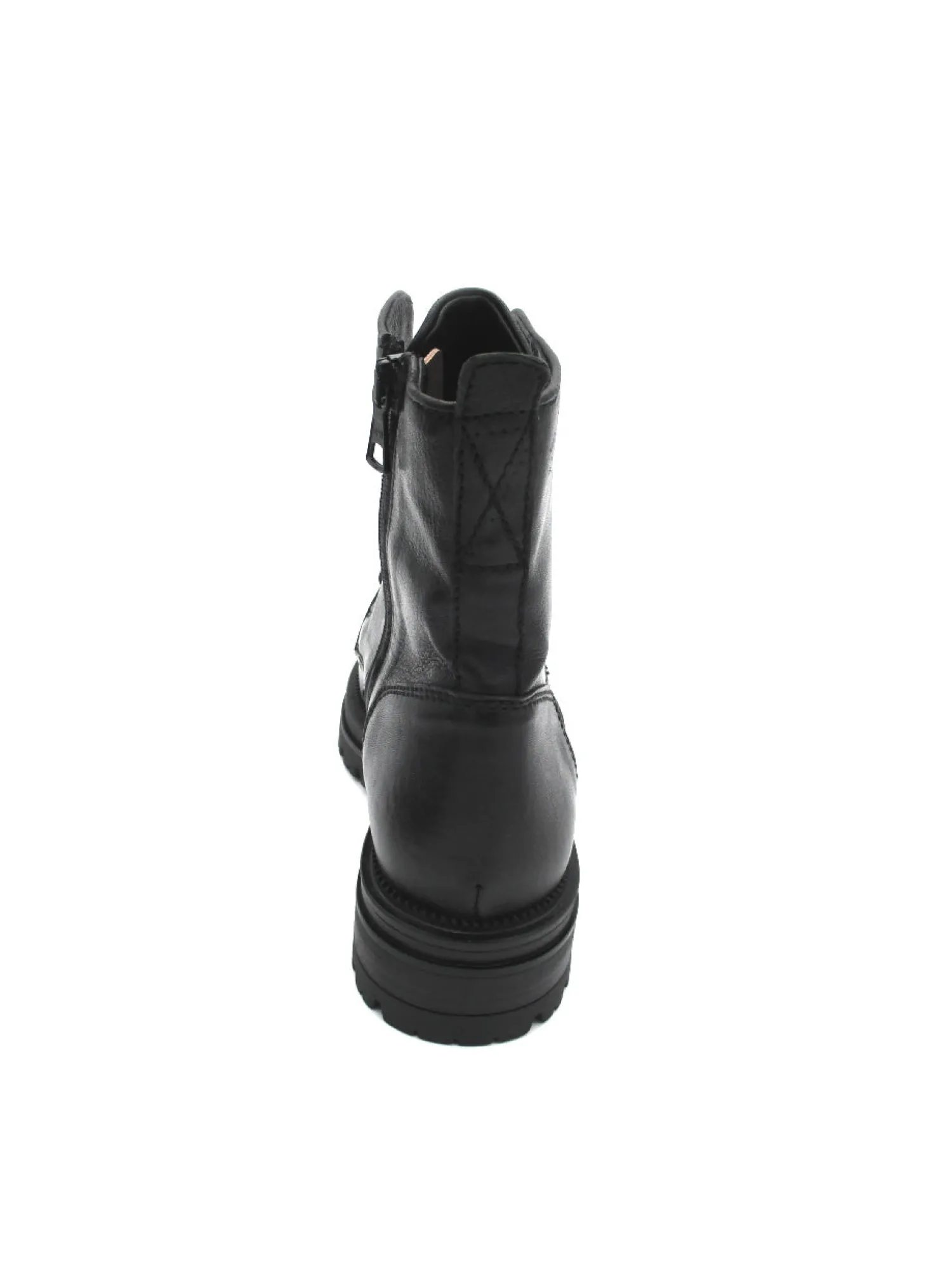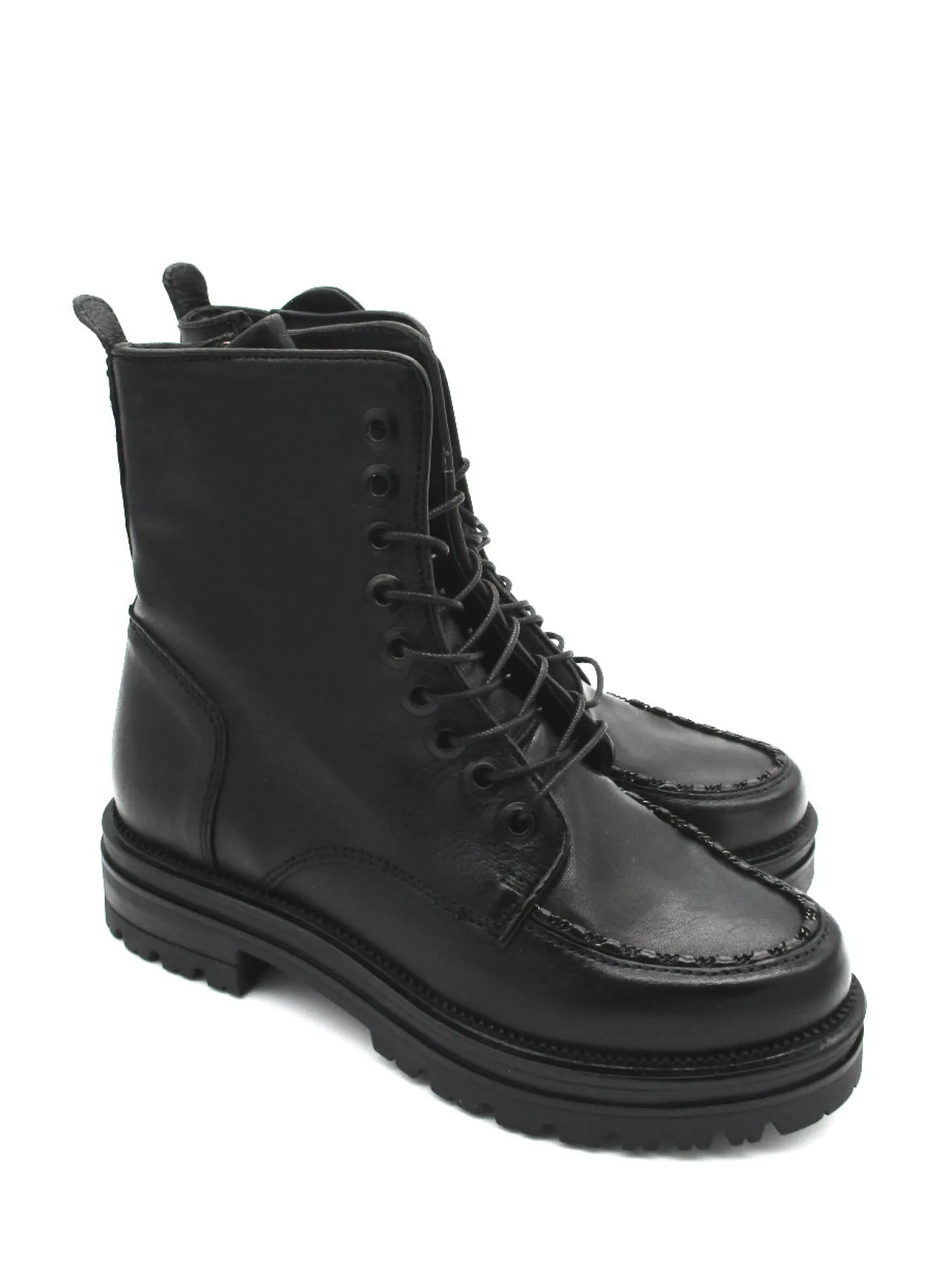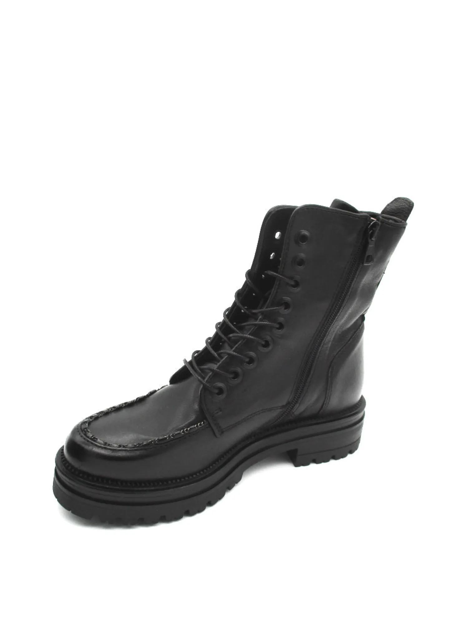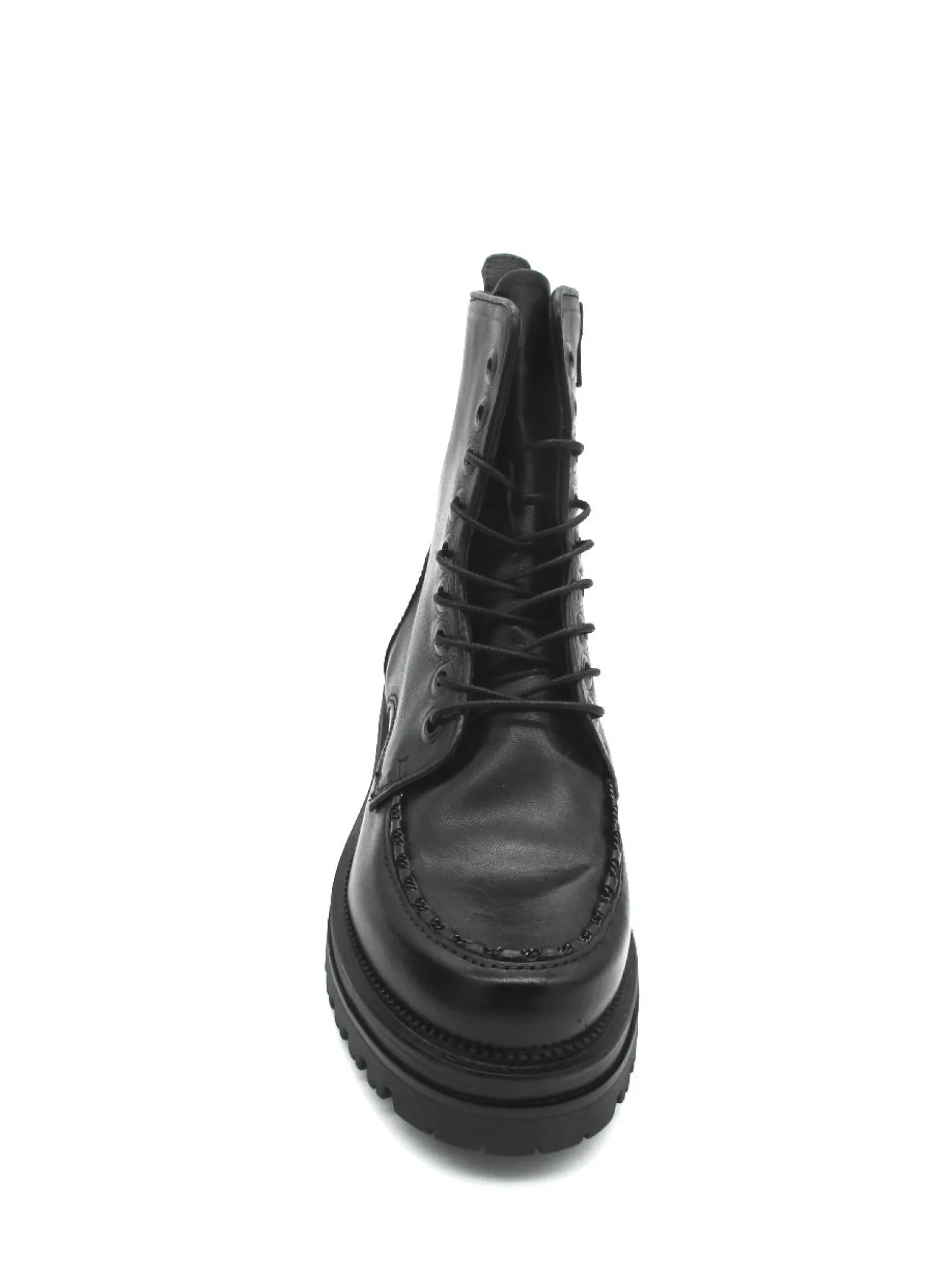 Anfibio donna in pelle con lacci e lampo interna per una allaciatura poiù veloce. Suola in gomma a carro armato tacco 4,5 cm e gambale di 21 cm.