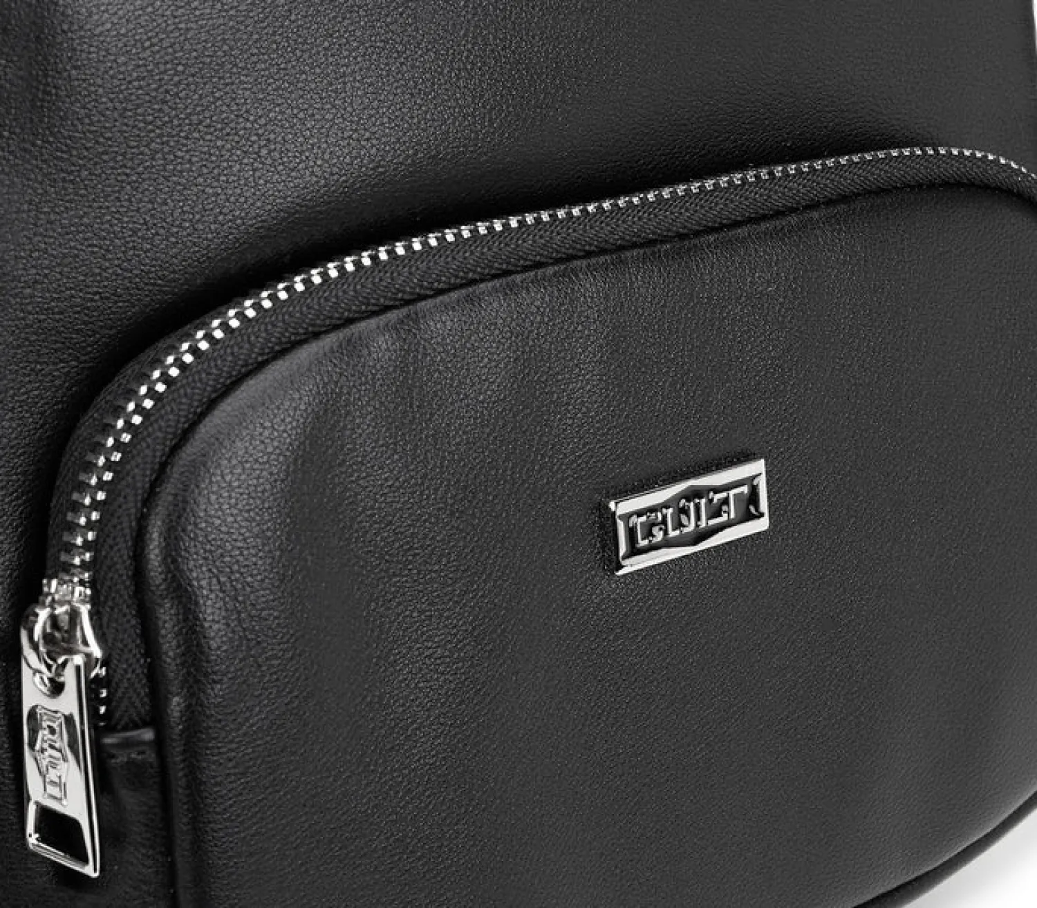 Zaino da donna in caratteristica tinta nera di Cult è realizzato in morbida ecopelle. Il modello è dotato di spalline regolabili per un trasporto pratico e comodo e di chiusura a zip superiore. Presenta una tasca esterna frontale con chiusura a zip e uno scomparto interno con due tasche. Ideale per un look audace. Dimensioni 21×25,5×8